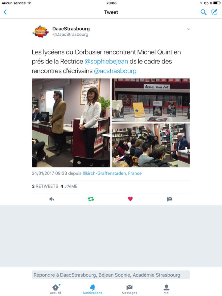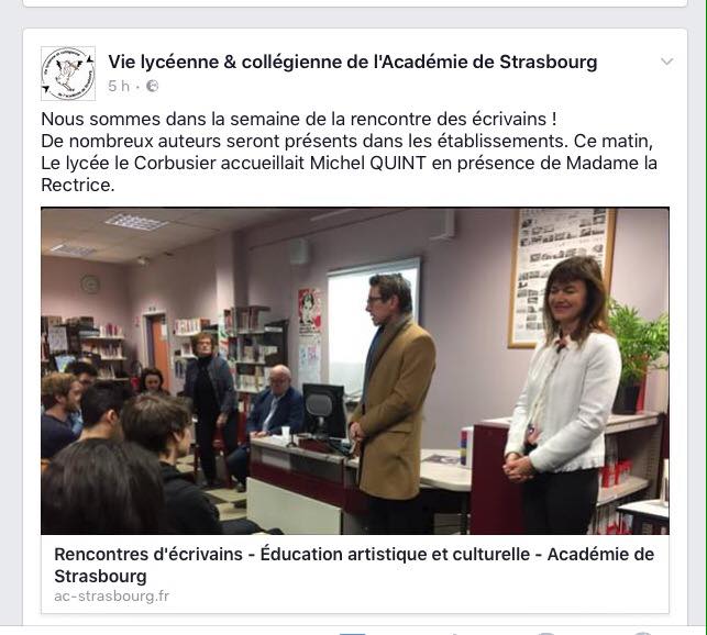“Pendant deux heures, questions et réponses ont fusé, fruits d’un bon travail de préparation effectué en amont avec leurs professeurs M. Aubert, Mme Ory et Mme Kneib. « Qu’est-ce qui vous inspire ? » « Combien de temps pour écrire un livre ? » « Que lisez-vous ? » « L’écriture est-elle une vocation ? » À chaque fois, Michel Quint a pris le temps de répondre non sans humour en puisant dans sa mémoire les éléments de sa vie qui expliquent son processus créatif – si tant est qu’il soit possible de l’expliquer.” DNA 29/01/17 par E.B.