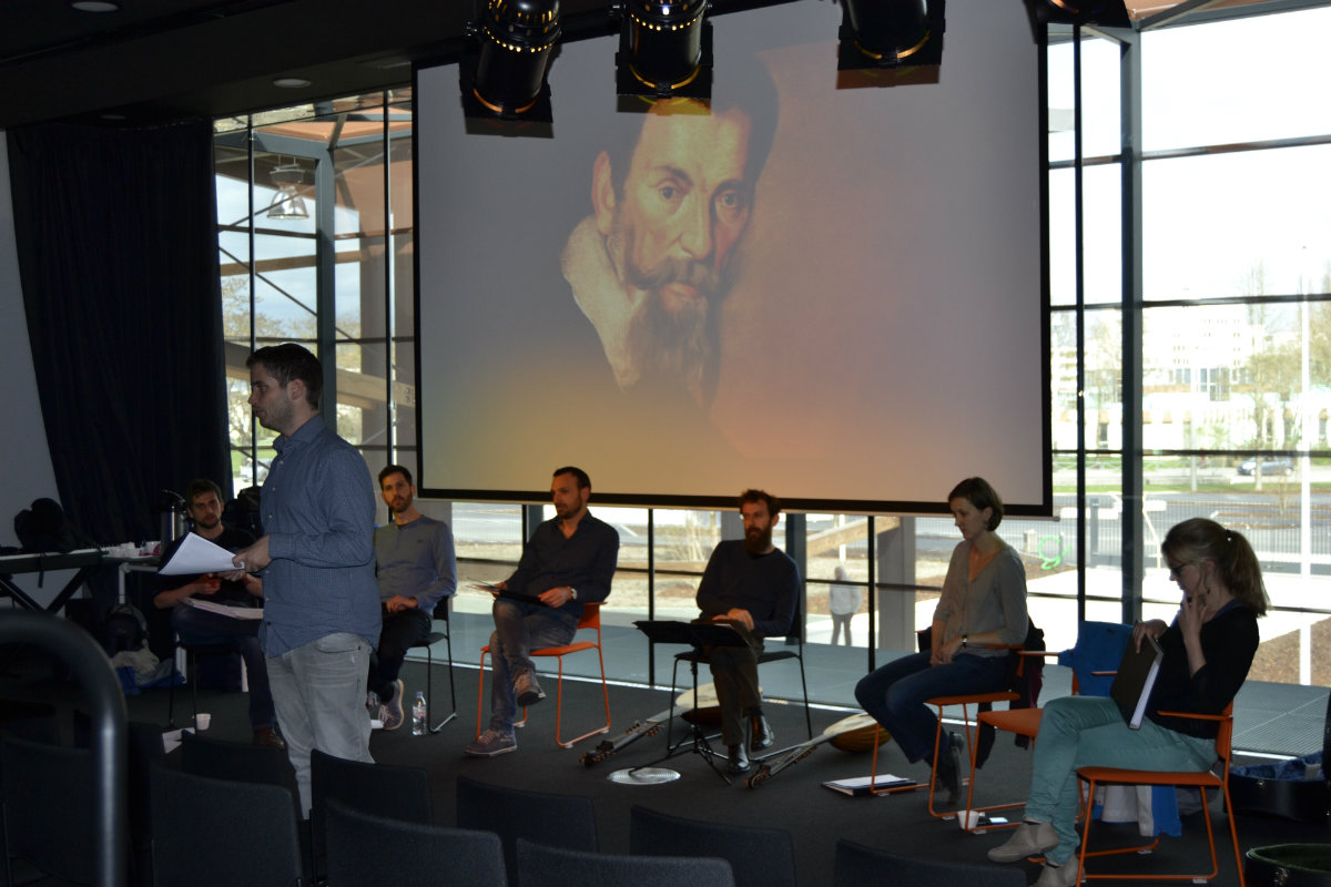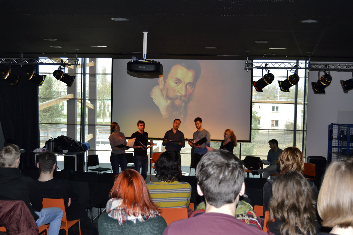 La prestation préparée pour le lycée Le Corbusier, centrée sur des madrigaux (poèmes mis en musique de manière très descriptive) de Monteverdi a permis aux élèves et étudiants du lycée de découvrir cet art et surtout d’en analyser la structure pour mieux le comprendre et l’apprécier. Le madrigal « Ecco mormorar l’onde », description d’un levé du jour, servit de décor à la présentation des différentes tessitures vocales. Une passacaille jouée à l’archiluth permit d’introduire la notion de basse continue, petite phrase musicale répétée indéfiniment, qui est une des caractéristiques de la musique baroque. Quelques exemple de musiques actuelles ont suffi à démontrer que cette technique est encore couramment utilisée. Les chanteurs se sont ensuite livrés à une improvisation vocale sur une basse continue jouée par les élèves en percussions corporelles.