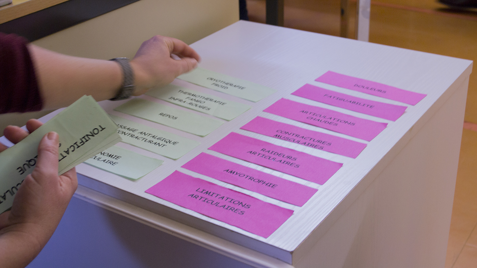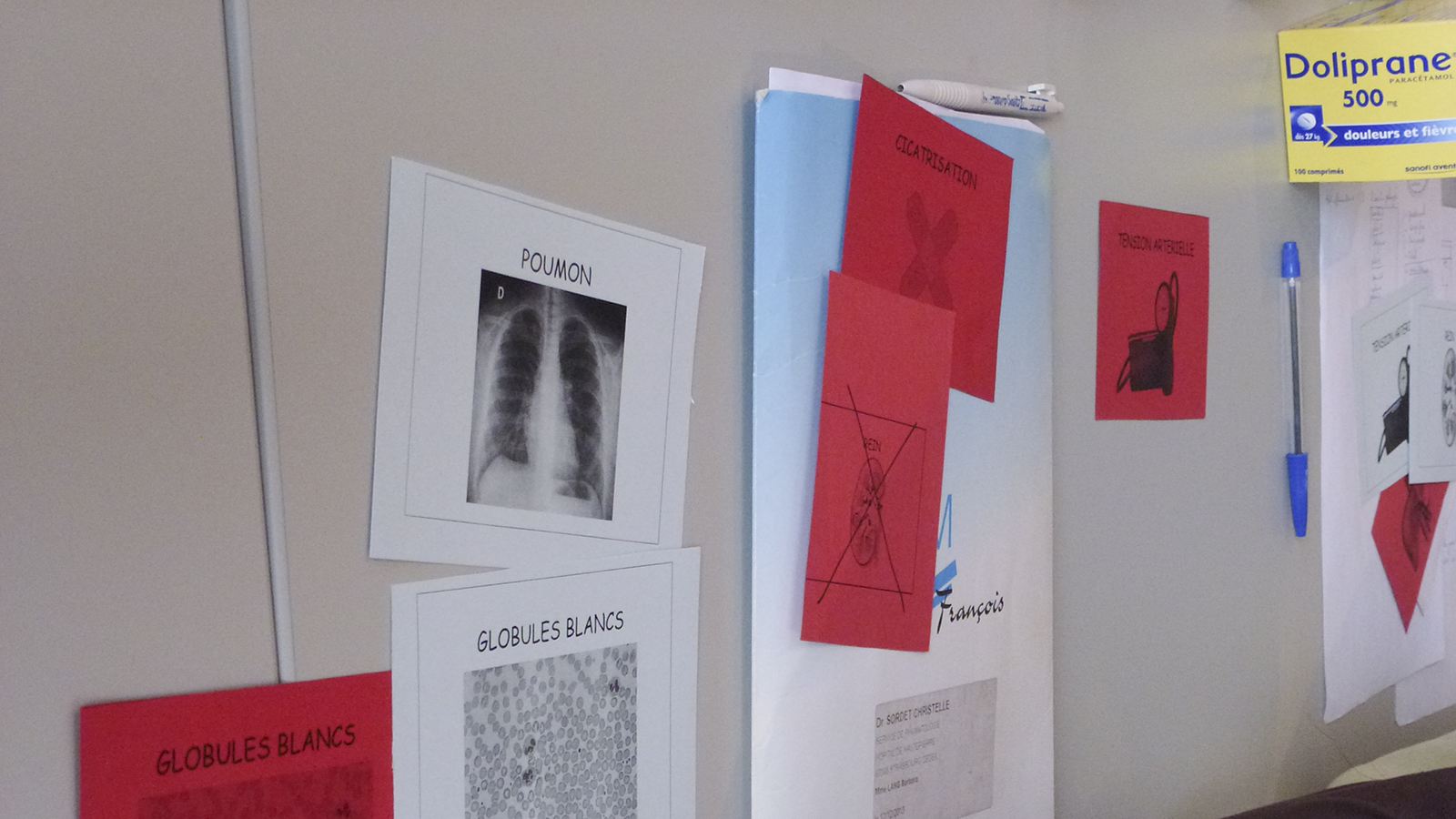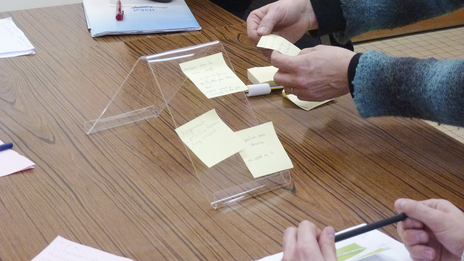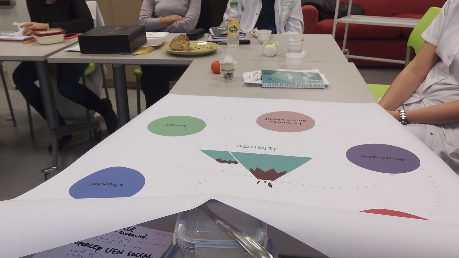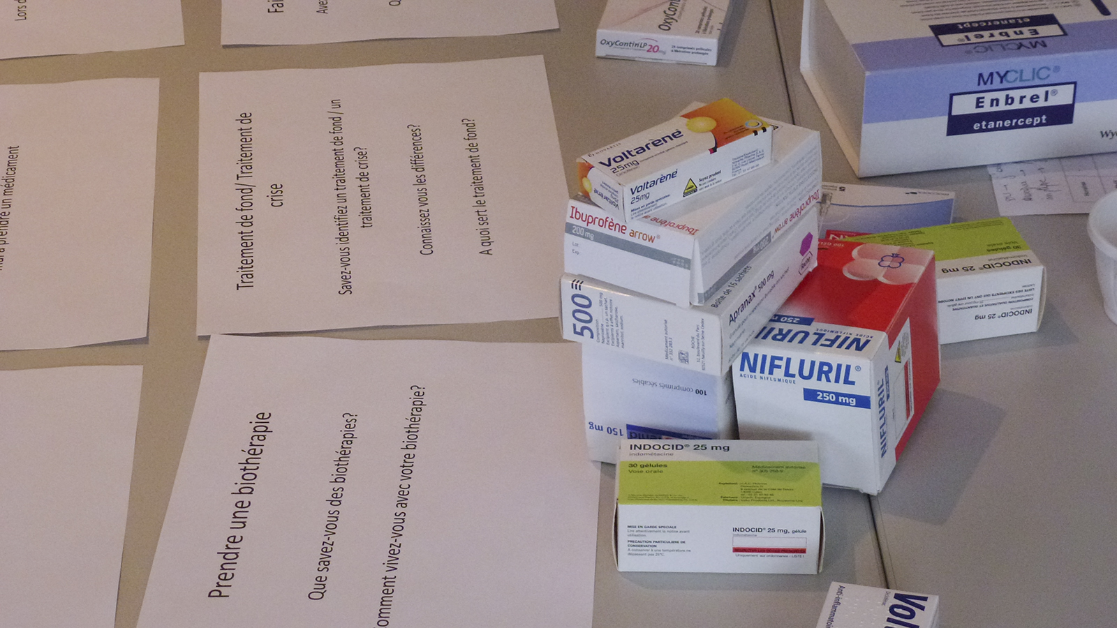 Nous avons assisté pour la première fois à une journée d’éducation thérapeutique, jeudi 8 Janvier. Quatre patients étaient présents. Les domaines d’interventions sont divers : rhumatologie, pharmacie, diététique, ergothérapie, assistance sociale, kinésithérapie, infirmière, … Chaque intervenant fait intervenir ses propres supports pour faire participer au mieux tous les patients, cela va de la manipulation d’objets ‘réels’ aux mini-jeux de rôle. Les participants prenant peu de notes, nous nous sommes demandé comment garder trace de la journée.