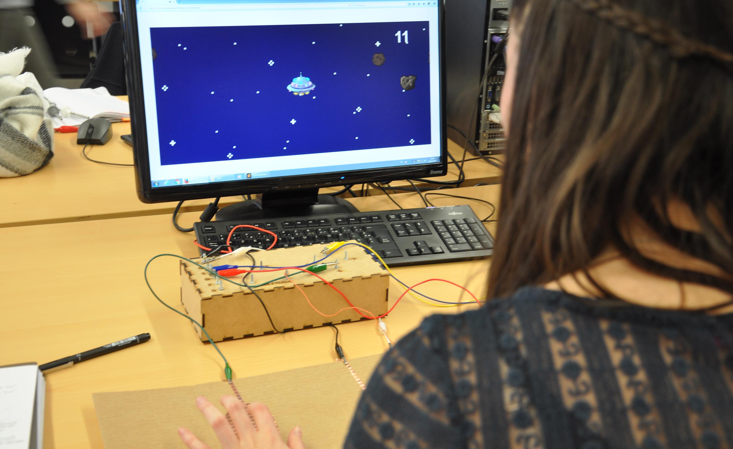 [Le jeu est long à charger à cause du préchargement des sons et images et le système de reset/rechargement ne fonctionne pas via la page processing mais est fonctionnel sous firefox]Le jeu Space Collider nécessite réflexe et rapidité pour que notre soucoupe volante puisse éviter le maximum de météorites (et ainsi parcourir le plus de distance possible). L’écriture du code de jeu sur langage P5.js (un dérivé du java script) mettait en place des commandes/touches que nous avions personnaliser avec le makey-makey avec les solutions de notre choix. Certaines difficultés ont été rencontré en vu du principe de “reload” ou de rafraîchissement du jeu (de la page) et aussi concernant le principe de game over.