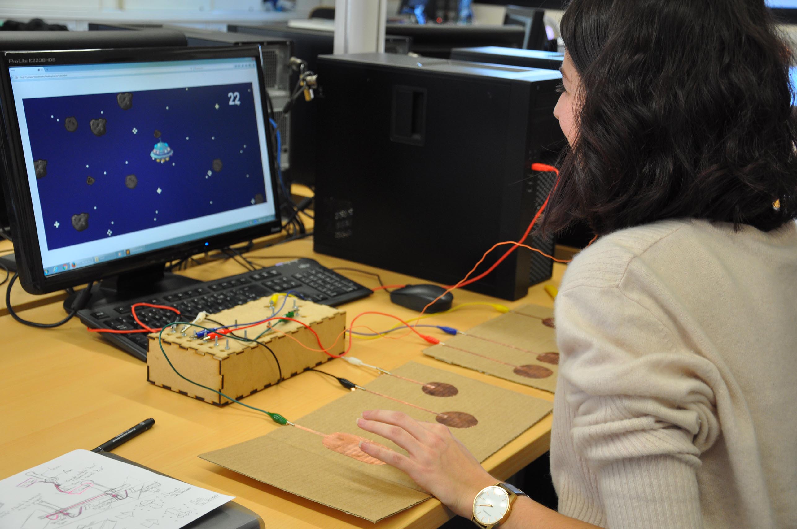 L’objectif de ce projet vidéo-ludique est de revisiter les fondements du gameplay traditionnel en créant le jeu via le code (P5.js) et en fabriquant sa propre “manette de jeu” (le medium et les moyens mis en oeuvre pour jouer au jeu) à l’aide du système makey-makey.