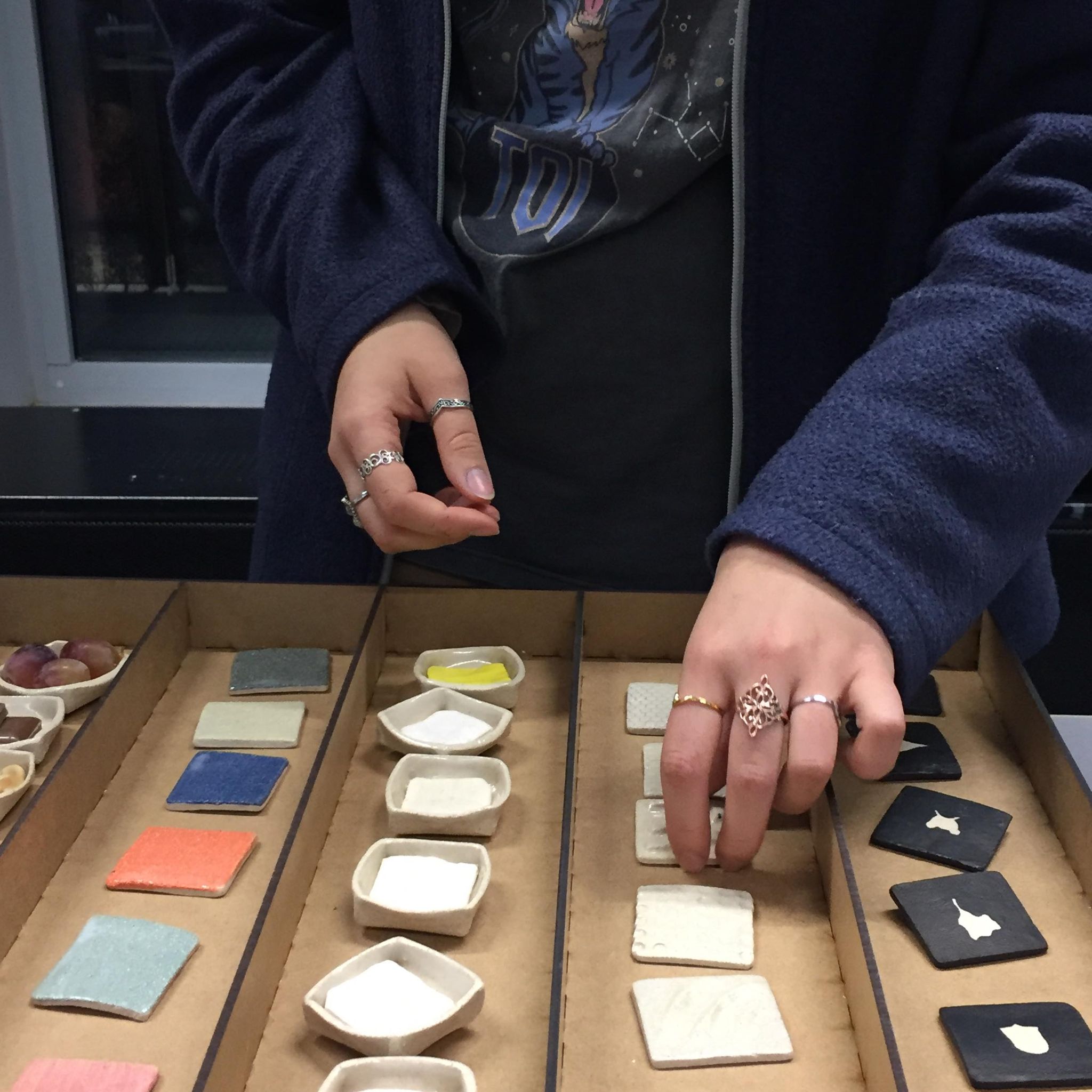 Pour les matériaux principaux utilisés dans la conception de l’outil, il s’agit de la céramique (le grès) et du bois. La céramique a pour avantage de pouvoir être façonnée avant la cuisson, parfaitement adaptée notamment pour la fabrication des coupelles et des reliefs pour le toucher. Aussi, le grès est intéressant dans son aspect. En effet, il exprime une certaine fragilité et préciosité. Il garde cependant un semblant très brut et naturel. Pour le choix du bois, il s’est fait de manière naturelle. Ce matériau permet d’obtenir très facilement une structure solide mais légère. De plus, sa coupe à la découpe laser est efficace et précise.