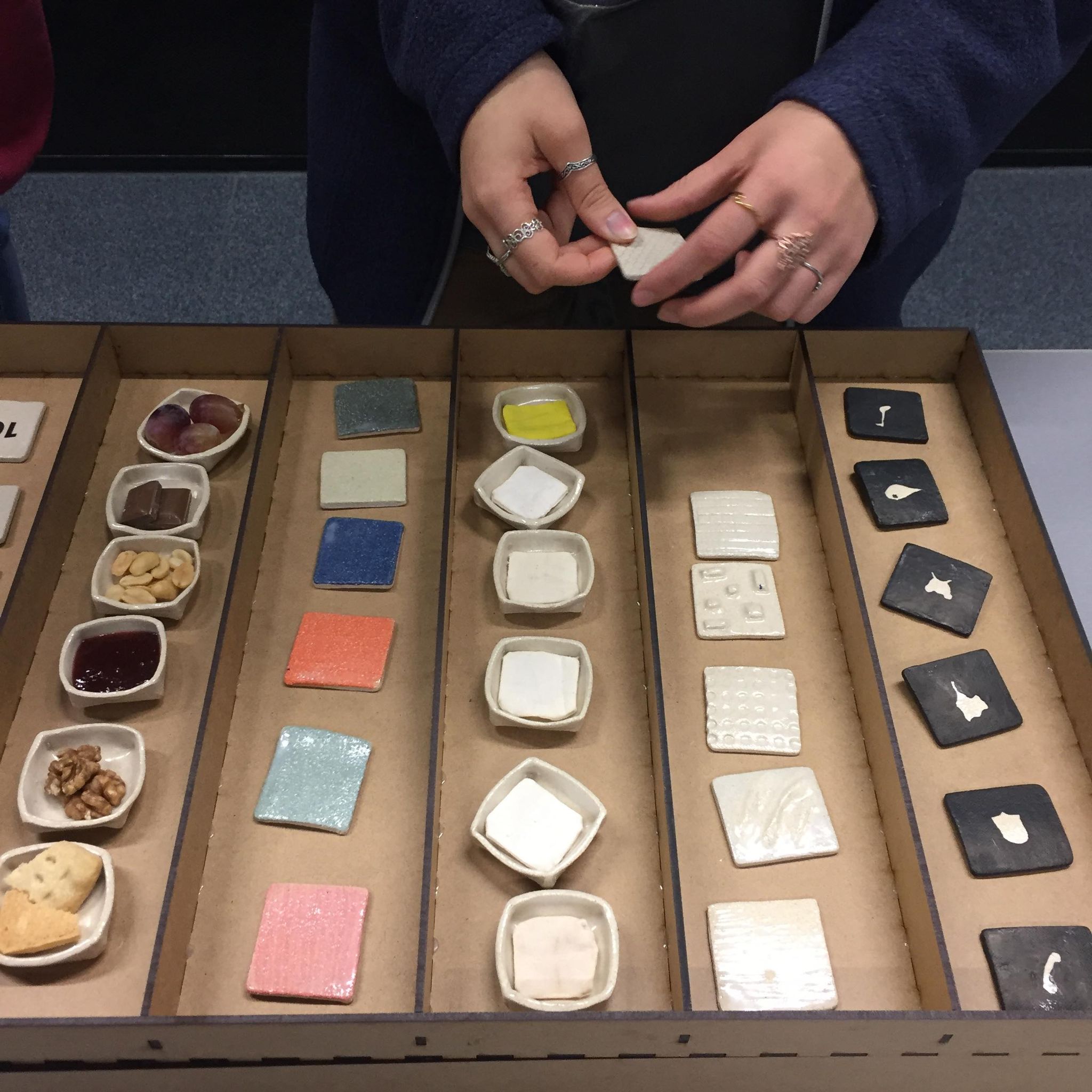 Chaque sens présente 6 propositions. Pour la vue, le participant doit choisir entre différentes couleurs : bleu foncé, bleu clair, beige, orange, vert foncé et rose clair. L’odorat est composée d’huiles essentielles et d’épices. Pour le goût, il y a du raisin, des noix, des cacahuètes, des biscuits secs, du chocolat ainsi que de la confiture. Le toucher est matérialisé par les différents reliefs faits sur la céramique (voir photo). Pour l’ouïe, les sons sont activés au moyen d’une barre conductrice placée sous le plateau de bois. On peut entendre la cloche d’une église, un cours d’eau, la sonnerie d’un vieux téléphone, les chants d’oiseaux dans la nature, le son d’une vieille radio, et d’un réveil. Pour finir les âges à choisir dans la dernière étape de l’atelier sont 65, 75, 80, 85, 90 et 100 ans.