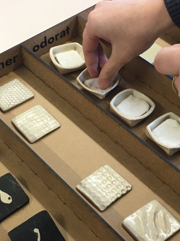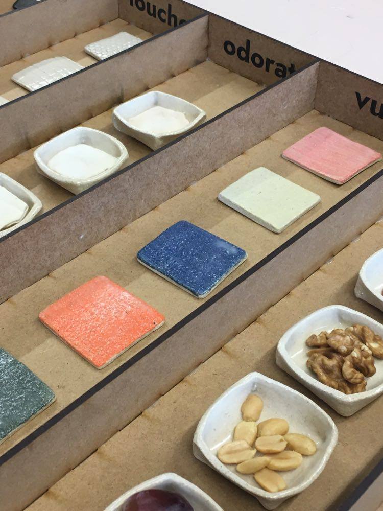 L’outil est donc composé d’un plateau en bois avec 6 compartiments comportant soit des coupelles, soit des carreaux de céramique. Les coupelles correspondent aux sens goût et odorat. Les autres sont représentés par de simples carreaux.