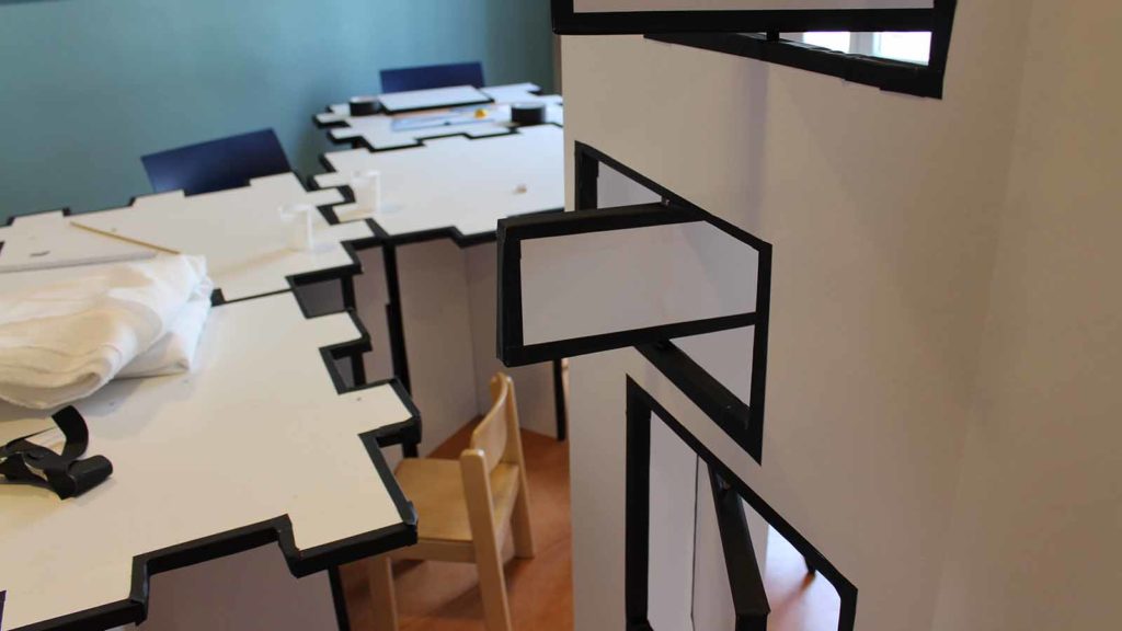 Les futureurs s’installent au deuxième étage. Après conception et fabrication de leur scénographie, ils finissent par prendre place dans l’accueil : trois panneaux, quatre tables modulables ainsi qu’une table pour enfants faite sur place.