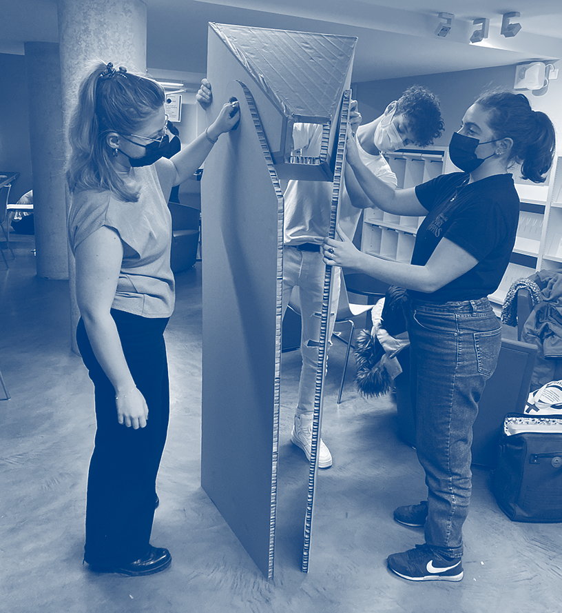 Aujourd’hui nous nous sommes séparés en deux groupes, afin d’être plus productif. Pendant que deux s’attelaient à installer le premier personna “ ALBA “ au troisième étage, le reste de l’équipe a construit une table d’orientation. Celle-ci a pour objectif d’introduire les personnas au centre de l’escalier central, avant que les usager.e.s parcourent les étages.