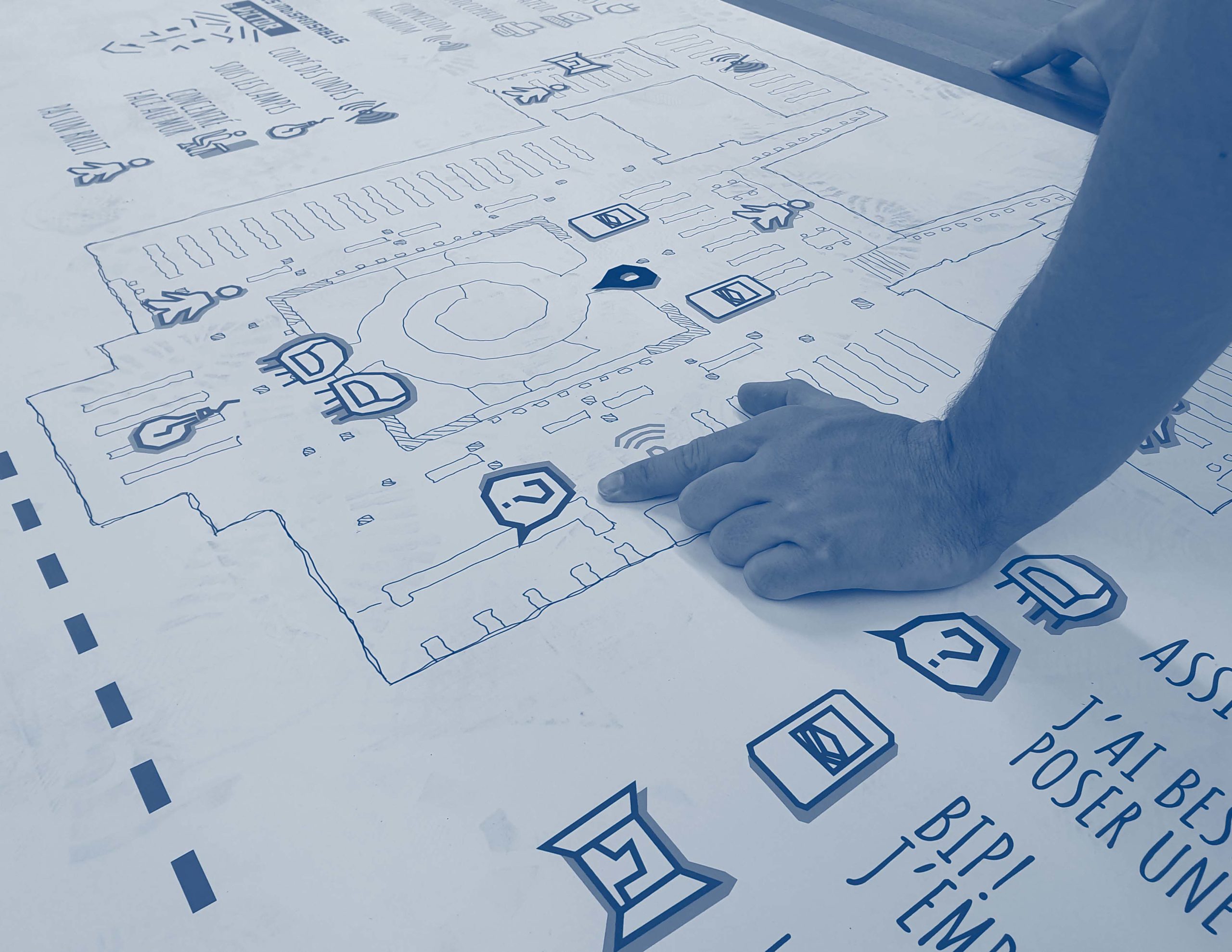 Une première carte test a été installée au troisième étage. Nous avons pu relever les éléments à modifier, trier l’information, hiérarchiser l’importance des légendes, réfléchir à un titre… Le format est encore trop timide, les usager.e.s ne font pas toujours attention. Nous avons listés les éléments graphiques à modifier afin d’avoir une mise en page didactique qui permet de comprendre en un regard. Dans un second temps, nous avons mis en scène les personas sur la table d’orientation, écrit les légendes et dessiné les pictogrammes. Avant de partir, nous avons placé la table au centre de la BNU.