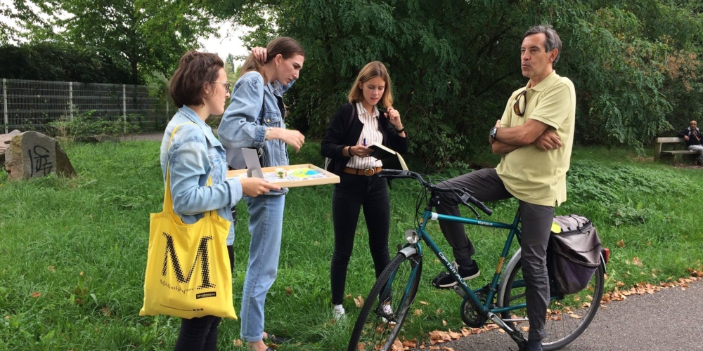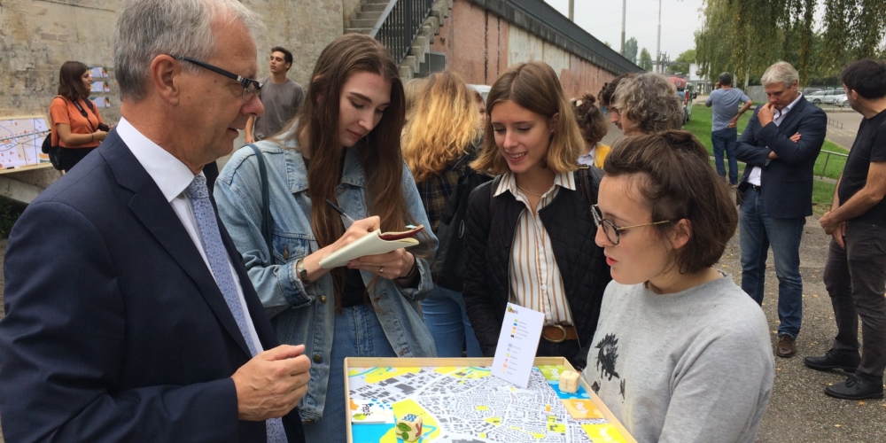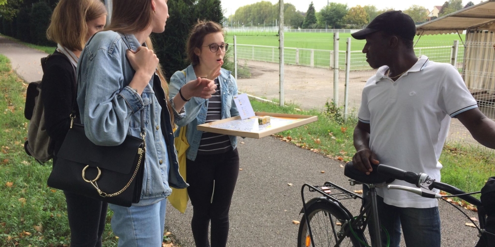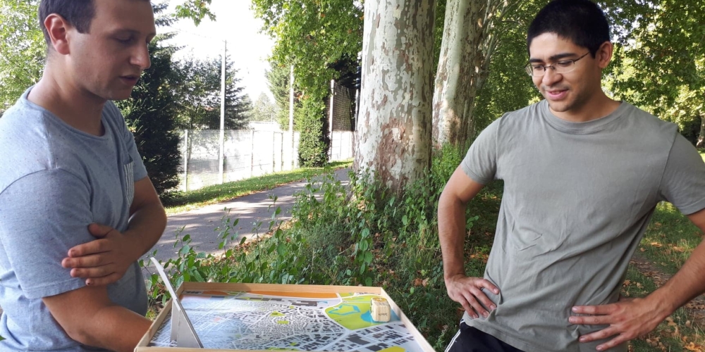 Afin de nous aider à définir notre projet, nous nous sommes d’abord concertés afin de définir quels aspects du canal nous souhaitions améliorer ou revisiter… C’est donc autour de la table que nous, les membres du Studio Pep’s avons commencé à s’interroger et échanger. Alors que Pauline déplorait le manque d’infrastructures et avait à cœur de transformer les abords du canal en un lieu de détente, Camille répondait «Il serait bien de créer des espaces aménagés et évolutifs le long du canal, pour que les promeneurs puissent se rencontrer». Jean et Audrey, quant à eux imaginaient le canal comme un lieu d’échange et de rencontre, redynamisé par une signalétique nouvelle et d’avantage d’informations pour les promeneurs.Nous avons donc imaginé un outil se présentant sous la forme d’un jeu de plateau. L’idée est simple, efficace, et ludique: jeter les dés pour mieux discuter, délier les langues et parler de son quartier, de ses idées. Le jeu se compose d’un plateau et de deux dés. Sur le plateau figure une carte simple, haute en couleur qui reflète la vision d’une ville et d’un projet joyeux, ouvert et proche des gens. Celle-ci permet au joueur de situer la zone du canal d’Illkirch étudiée par notre studio afin de récolter des avis ou impressions. L’idée? Se repérer, se projeter, pour mieux communiquer. Les deux dés portent respectivement sur leurs faces des pictogrammes représentant des aspects concrets du site ou bien des idées ou principes, présentés sous forme de mots clefs. En lançant ces derniers, le joueur est donc confronté à une association d’idées, telles qu’un pictogramme représentant la végétation associé au mot « quotidien » ou bien encore un pictogramme représentant l’eau associé au mot « partage ». Les faces s’associent, se répondent, se complètent et permettent à l’usager de se questionner, créant ainsi un réel échange sur la zone du canal qui intéresse notre studio. Aux couleurs du studio Pep’s, cet outil ludique nous permet donc, rencontre après rencontre de récolter une variété de réponses, d’idées sur une multitudes de sujets ciblés. Ce jeu n’est pas qu’un moyen d’obtenir des informations, mais permet la naissance d’une rencontre, d’un échange, d’un moment de partage, et le début d’un projet…