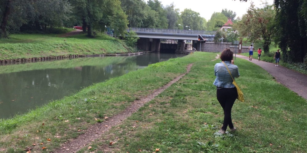 Je l’ai toujours longé en passant sur l’autoroute A35, observant les rangs de platanes majestueux qui accompagnent son chemin. Quelle ne fut pas ma surprise lorsque nous avons entrepris de longer ce dernier à vélo, et que j’y ai découvert une atmosphère complètement différente. Les arbres qui d’habitude défilaient à folle allure au travers de la vitre de l’automobile rythment maintenant lentement ma promenade au bord de l’eau. Le calme présent sur les rives du canal semblait imperturbable, en opposition totale avec la vitesse et le bruit présents sur la route.