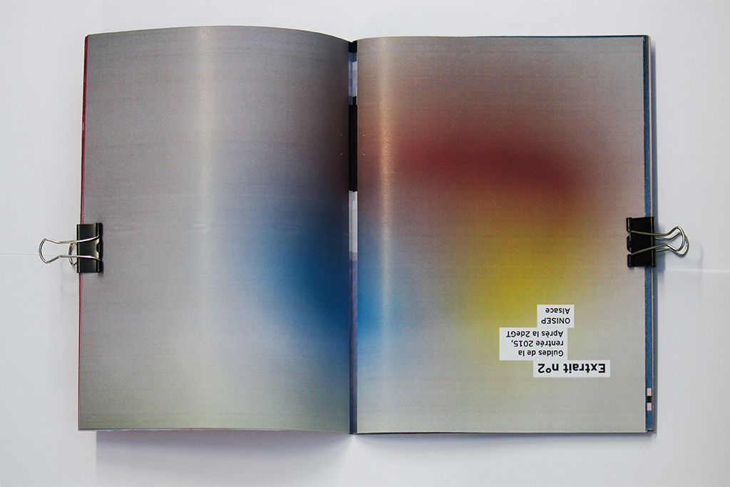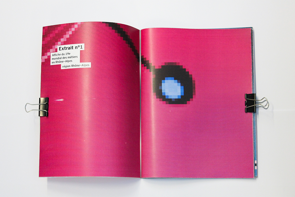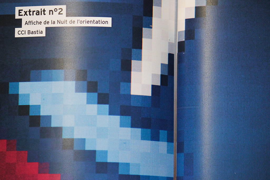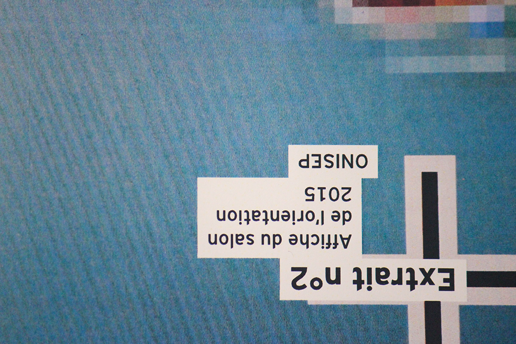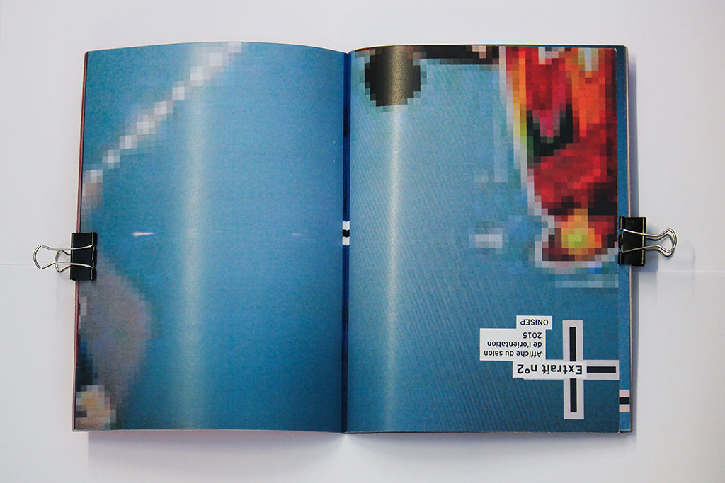 L’orientation est souvent perçue par les parents et leurs enfants comme quelque chose de flou, de complexe. Noyés sous une masse d’informations, parfois contradictoire, cette édition est l’expression visuelle de leur sentiment face aux codes et au langage liés au parcours de l’orientation. Les visuels sont des extraits, des captations abstraites issus d’affiches de salon et de documentations autour de l’orientation. Ils obligent l’usager à interpréter leur signification, à créer du sens avec le peu de données dont ils disposition. Les pages sont tantôt disposées à l’endroit, tantôt à l’envers, contraignant l’utilisateur à retourner constamment le livret, créant alors un sentiment de gène, de confusion.