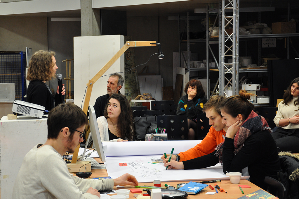 Ce premier essai m’a aidé à pointer les failles de l’atelier : les objectifs d’intervention des élèves se doivent d’être plus clairs. Il convient alors peut-être de découper l’atelier en plusieurs étapes, de créer plusieurs temps pour atteindre les attentes que j’espère de cette intervention. Le médium choisi n’est peut-être pas adapté à ce type d’exercice, en effet, des dessins de principes sont plus ressortis que souhaité. De plus, capter l’attention des élèves durant un atelier estimé à deux heures ne sera pas chose facile non plus, peut-être faudra-t-il miser sur les nouvelles technologies…