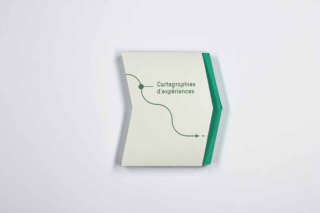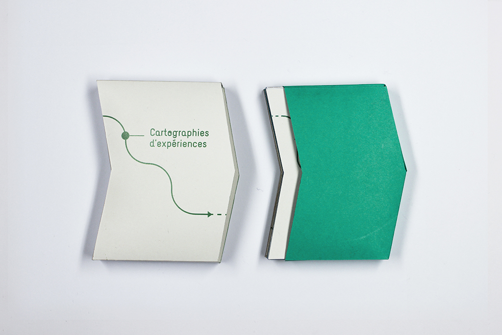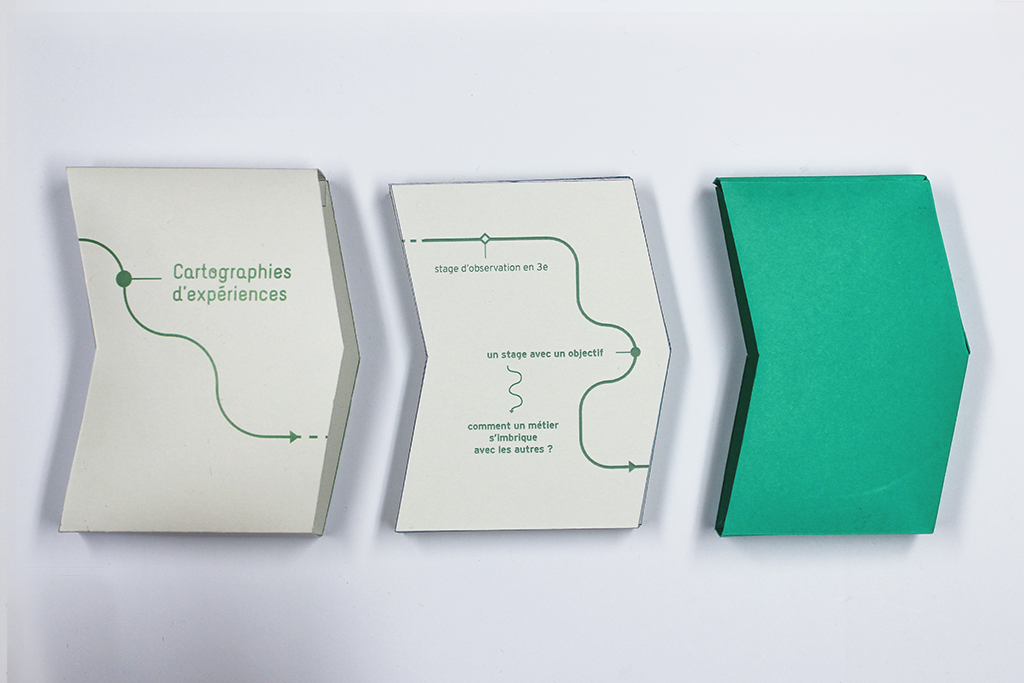 Je suis allée à la rencontre de cinq personnes leur demandant de me raconter leur première expérience dans le milieu professionnel. À l’aide d’un sketchnoting, j’ai pris note de leur récit et ai récolté diverses verbatims fortes. J’ai scindé leur histoire en 7 étapes clés : la motivation de leur première rencontre, le lieu de l’expérience, les conditions de la recherche, les activités qu’ils ont effectuées, le résultat qu’ils en ont tiré, la pertinence pour leur orientation et la production qu’il en reste aujourd’hui. Je les ai retranscrit graphiquement, avec le soucis de rendre compte d’un cheminement, d’un parcours. Ces extraits de vie prennent alors forment sur des cartes interchangeables les unes avec les autres et sur lesquelles le tracé fluctue, se module selon l’état d’esprit et la précision du souvenir récolté.