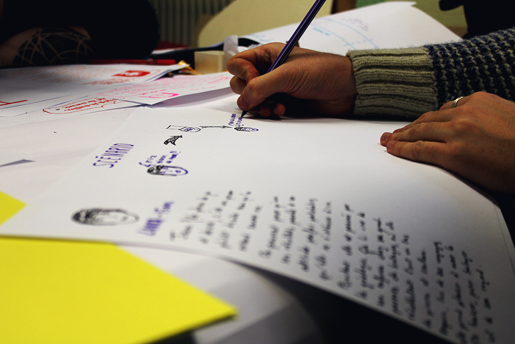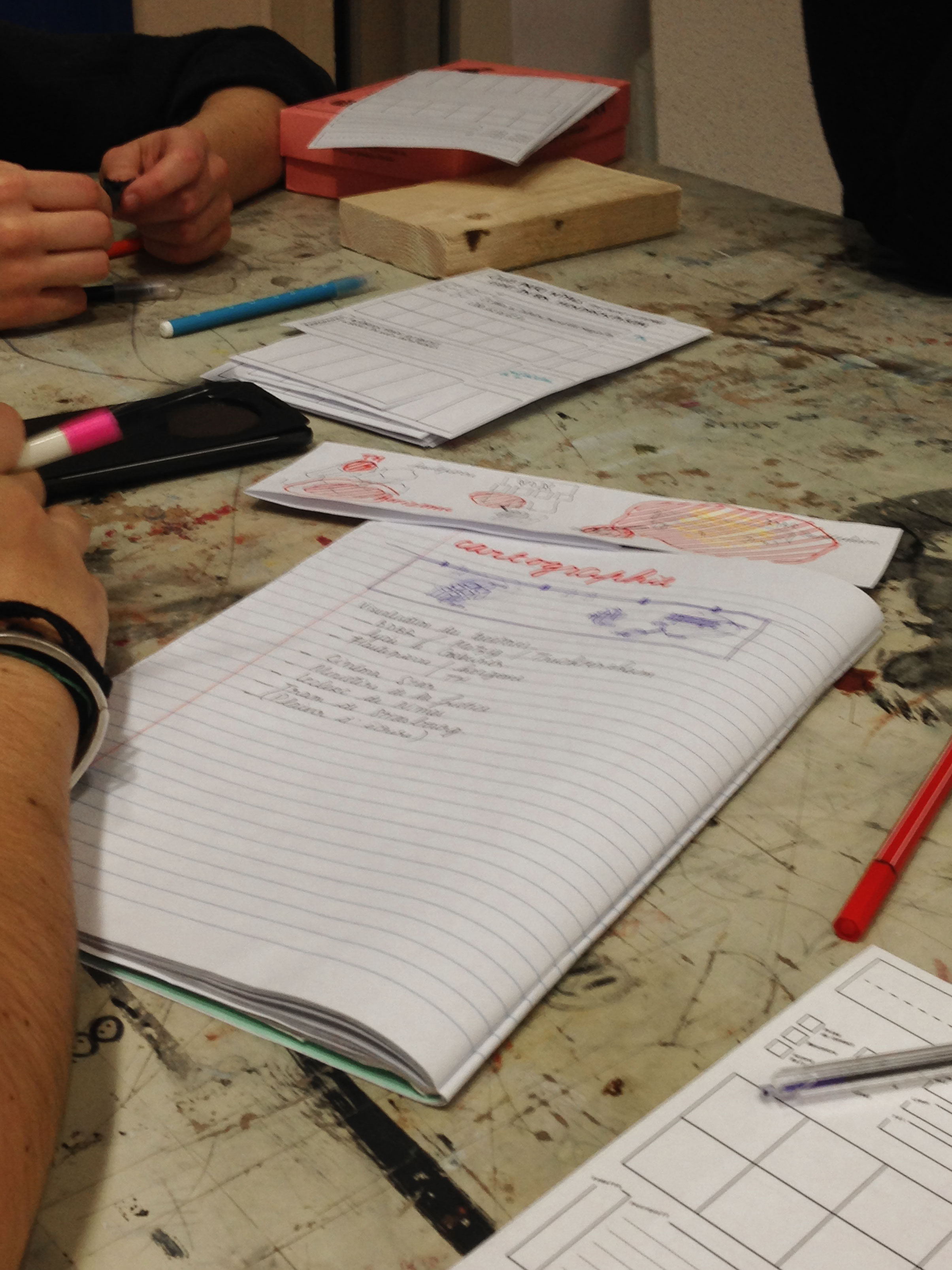 Ce jeudi, nous mettons nos contacts, nos plannings et nos idées de projet en commun. Nous créons ensemble plusieurs outils afin de mutualisation nos ressources : un carnet d’adresse, un carnet de projet rassemblant et datant toutes nos actions sur le terrain passées et futures (entretien, observation, prototypage…) ainsi qu’une cartographie recensant nos terrains d’action actuels et souhaités.