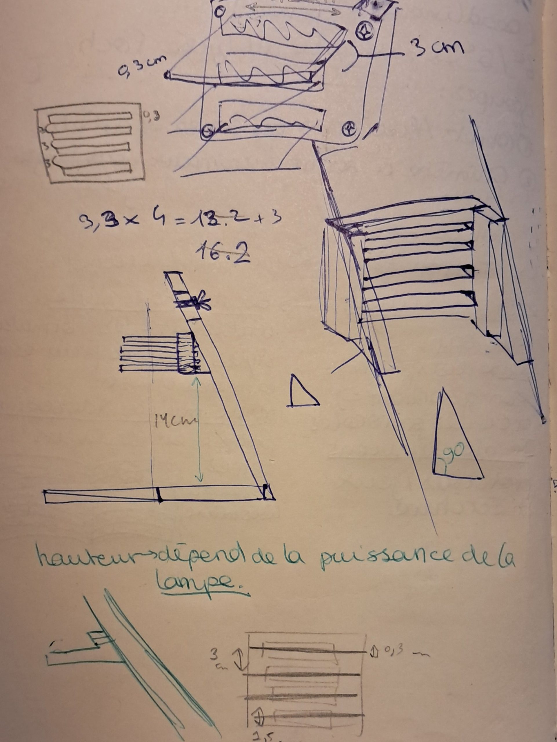 - Le projecteur constitué de tasseaux de bois vissés entre eux (ne pas oublier les pré-trous), les plexis furent découpés à la laser, les éléments qui tiennent les plexis furent créés à la scie circulaire (même difficultés que pour les présentoirs), et sa protection lumineuse cousue par notre experte Sarah.
