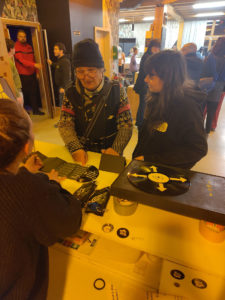 Comme la vie est une suite de surprises plus ou moins appréciées, les embuches se sont invitées à la soirée de test de la V2. En effet, arrivant pour la mise en place, nous constatons, malheur, avoir oublié un câble. Mais pas n’importe lequel : LE câble, celui qui devait permettre l’alimentation de notre superbe platine vinyle. Pas de panique (si si, panique, grosse panique même en réalisant la fatalité de la situation), grâce à l’aide de Fleur, d’Estelle et de Diane, nous avons réussi à trouver un moyen de faire fonctionner cette platine en collant 4 flèches découpées à la va vite. L’outil numérique nous faisant faux bond, il a fallu se reposer sur de la bonne vieille médiation. Le dispositif a plutôt été bien appréhendé par le public, public contenant une majorité de personnes sourdes et malentendantes, notamment grâce aux symboles qui permettaient de faire lien entre la platine et les carnets de questions. De plus, le fait d’avoir rédigé toutes les informations nécessaires au remplissage des partitions au sein de celles- ci a permis une compréhension fluide des attentes. Nous avons réussi à collecter des données quantitatives tout en entretenant des liens sociaux qualitatifs permis par la médiation. Ce que nous avons perdu en technique a été regagné en interactions sociales.