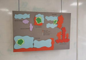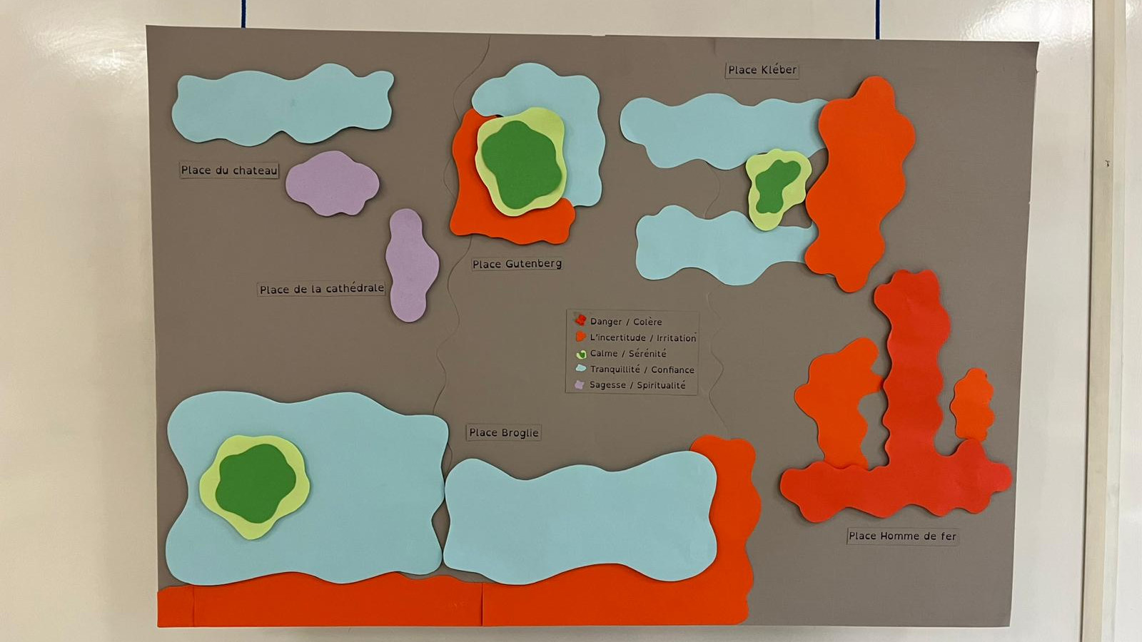 que nous avons finalement recouvert avec des feuilles cartonner Gris pour améliorer le contraste. Pour les zones de couleurs, nous avons réalisé des formes de différentes tailles et de formes différentes que nous avons mises les uns sur les autres.
