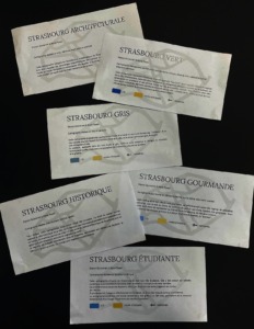 Le but de ce projet est de retranscrire le point de vue des habitants de Strasbourg sur leur ville à travers une série de cartographies sensibles représentant le centre de celle-ci (Grande île). Pour ceci, nous avons récolté différents adjectifs qualifiants Strasbourg et leur avons affilié des matériaux représentatifs de ces derniers.