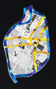Cette cartographie propose une représentation froide et urbaine du centre de Strasbourg. L’utilisation de la clay rappelle à la fois l’aspect minéral et le climat de la ville, où le temps est souvent gris, évoquant une atmosphère froide. La peinture, appliquée dans des tons froids et gris, renforce cette ambiance et souligne le caractère monotone de la ville, traduisant une perception de Strasbourg marquée par le béton et la grisaille.