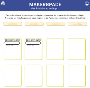 Nous sommes donc partis sur une page d’accueil avec tous les projets, une introduction sur ce qu’est cette plateforme et à quoi elle sert puis l’accès à des filtres sélectionnables renvoyant aux différentes matières, aux différents niveaux, aux différentes machines et aux différents collèges ayant un FabLab.