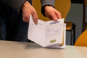 Les élèves complètent au fur et à mesure, étape par étape. D’abord le fichier numérique, l’usinage, l’assemblage et les finitions, en décrivant, dessinant et ajoutant des photos prises avec un appareil photo thermique. Et les collégiens terminent le carnet en complétant un retour critique.