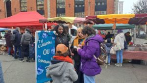 Dans notre projet, nous avons travaillé sur l’alimentation et son lien avec la santé. Au début, nous nous sommes posés une question : est-ce que les gens mangent vraiment sainement ? En effet, ce qu’on mange a un impact énorme sur notre corps, surtout les produits transformés et les conservateurs qu’on y trouve. Notre première idée était de poser une question directe : tu préfères manger une fois par mois au McDonald’s ou une fois par mois un repas végan ? Finalement, nous nous sommes rendus compte que cette question n’amenait pas les personnes à échanger. Aussi, nous avons changé notre approche : tu cuisines ou tu commandes ? Cette question nous a permis de mieux comprendre les habitudes des usagers du marché. Et elle nous a amené à envisager d’autres aspects de l’alimentation, comme l’impact des commandes en ligne sur les conditions de travail des livreurs.