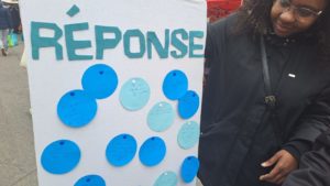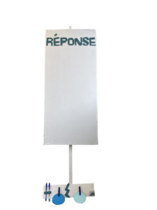 - Pour la banderole, nous avons pris un morceau de tissu que nous avons transformé afin d’en faire une banderole. Au départ, nous souhaitions coudre la question directement dessus et réaliser l’ensemble en couture. Cependant, par manque de temps, nous avons trouvé une autre solution : nous avons utilisé du feutre. Nous avons découpé les lettres dans ce matériau, puis nous les avons collées sur la banderole à l’aide du scotch double face.