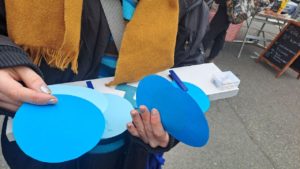 Ce dispositif a un univers graphique à la fois artisanal, texturé et ludique, qui mise sur la simplicité pour créer un lien direct avec le public. En effet, l’univers graphique s’inscrit pleinement dans une esthétique “fait maison” (DIY), ce choix délibéré permet aux usagers de se retrouver immédiatement dans le projet : il n’y a pas de barrière technologique ou institutionnelle, ce qui encourage l’interaction. De plus, la typographie joue un rôle central dans notre création; elle est lisible, impactante et donne une cohérence visuelle. Nous avons aussi utilisé un camaïeu de bleus et de blancs, une palette qui évoque souvent la clarté et la confiance. Enfin, la structure en bois (type pancarte ou totem) suggère la mobilité et l’occupation de l’espace public, invitant les passants à s’arrêter pour participer à cette “réponse” collective.