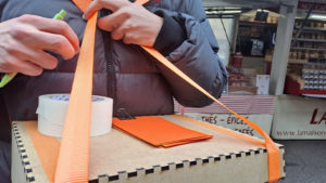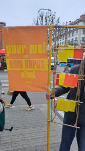 Nous avons commencé par créer un module qui peut se déplier afin de pouvoir le transporter facilement. Pour cela nous avons créé un premier module qui était une banderole soutenue par deux morceaux de bois tenus à la main. Le deuxième module reprenait le même système à la seule différence que le bois soutenait deux files de laine ou l’on y accrochait les réponses. Ces mêmes réponses étaient écrites grâce au troisième module qui était une table mobile accrochée sur le dos d’une des personnes.