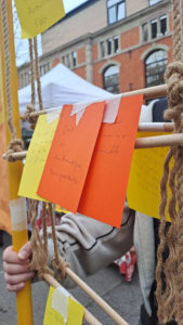 Maintenant l’échelle de corde qui soutient les réponses permet de présenter ces dernières de différentes manières. On peut la tenir pour créer une sorte de pont ou alors l’enrouler autour du poteau pour créer comme un deuxième drapeau, c’est cette deuxième version qui a été utilisé au marché et elle permet une chose simple qui est que durant la discussion les personne peuvent lire les réponse précédentes et potentiellement rebondir dessus ou se rendre compte que d’autre personne pense comme eux ce qui crée un lien invisible entre deux parfait inconnu, de plus si l’on accroche suffisamment de réponse cela vas créer un autre drapeau qui reprend les couleurs du premier et donc créé un véritable lien entre la réponse et la question qui se rejoins maintenant aussi bien dans le fond que la forme