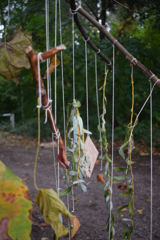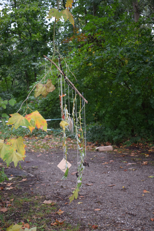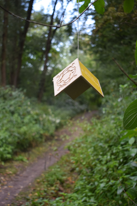 Le mobile que nous avons suspendu à l’entrée du circuit, par contre, ne se voit pas assez. Étant constitué de branches et de feuilles, il se fond dans le décor. Nous voulions à la base un élément signalant le début du parcours et signifiant qu’il se passe quelque chose, qu’il y a un événement autour de ce parcours. Or ce n’était pas le cas ici. Il aurait peut-être fallu utiliser d’autres matériaux ou mettre des couleurs afin que les randonneurs puissent le repérer aisément. Il manquait également le panneau explicatif qui sera disposé près de l’élément signalant, qui éclairera les randonneurs quant à l’utilisation de la Boîte à Légendes.