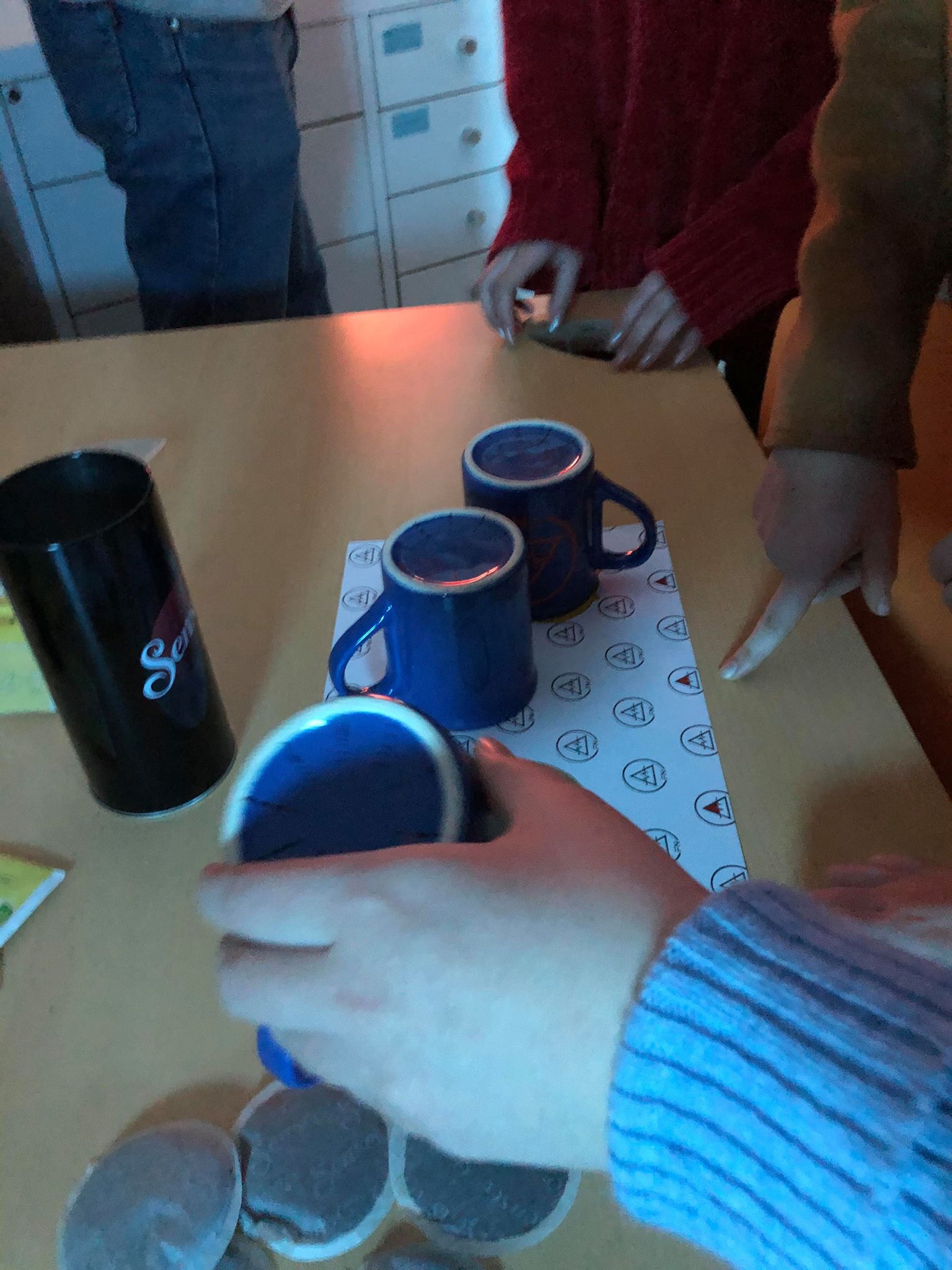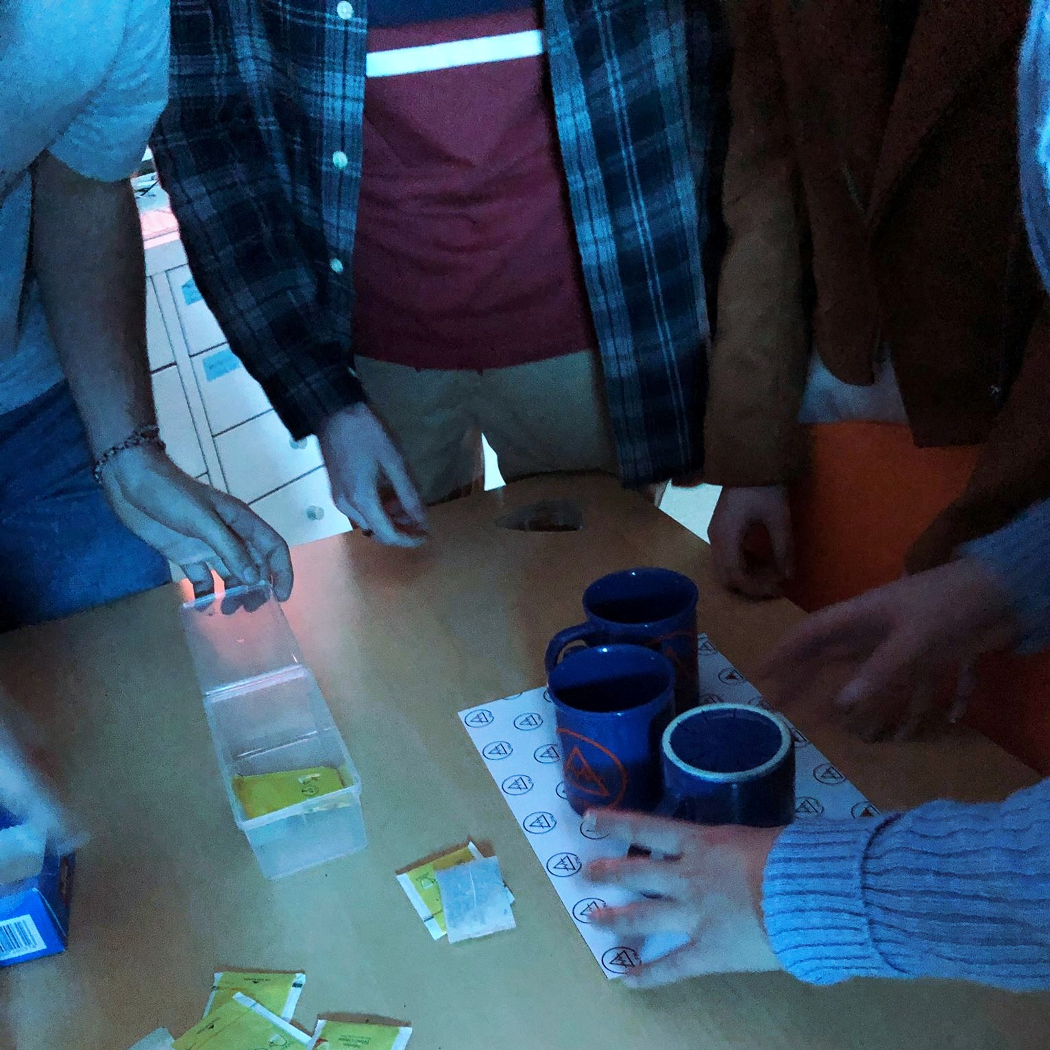 Cette énigme est un jeu de décryptage afin de débloquer le cadenas fermant la boîte qui contient la photo compromettante. Le but du jeu est ici de comprendre le code collé sur le dos de la tasse en s’aidant des marques de café fraîchement laissées sur le plateau des agents avant leur départ. Les tasses, en positionnant leur anse au bon endroit (ici au-dessus de la partie secondaire de la tâche) vont indiquer les bons chiffres à placer sur le cadenas pour l’ouvrir. La lecture de l’énigme se fait vue de haut et de gauche à droite. Pour trouver le chiffre, il suffit de compter le nombre de traits avant d’arriver en face du triangle rouge (ici le logo mis en valeur sur le napperon) en partant du zéro (de l’anse), on trouve ainsi 5 pour le premier, 2 pour le deuxième nombre et 6 pour le dernier. Le code est donc à entrer dans le cadenas. La boîte est maintenant ouverte.