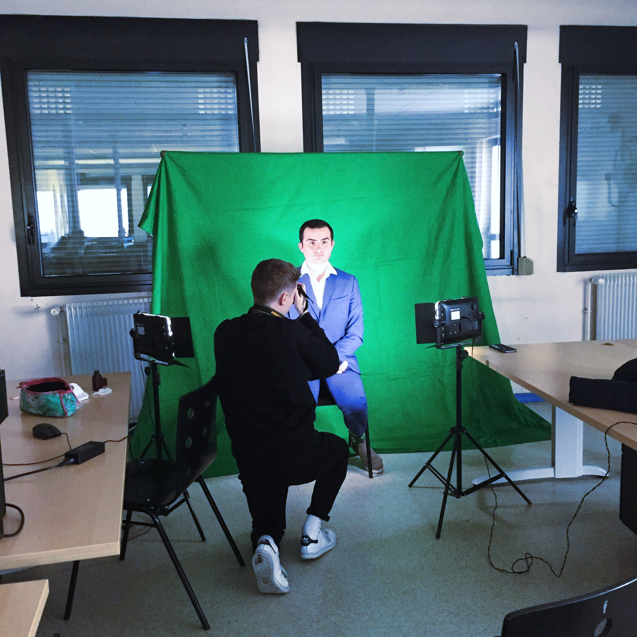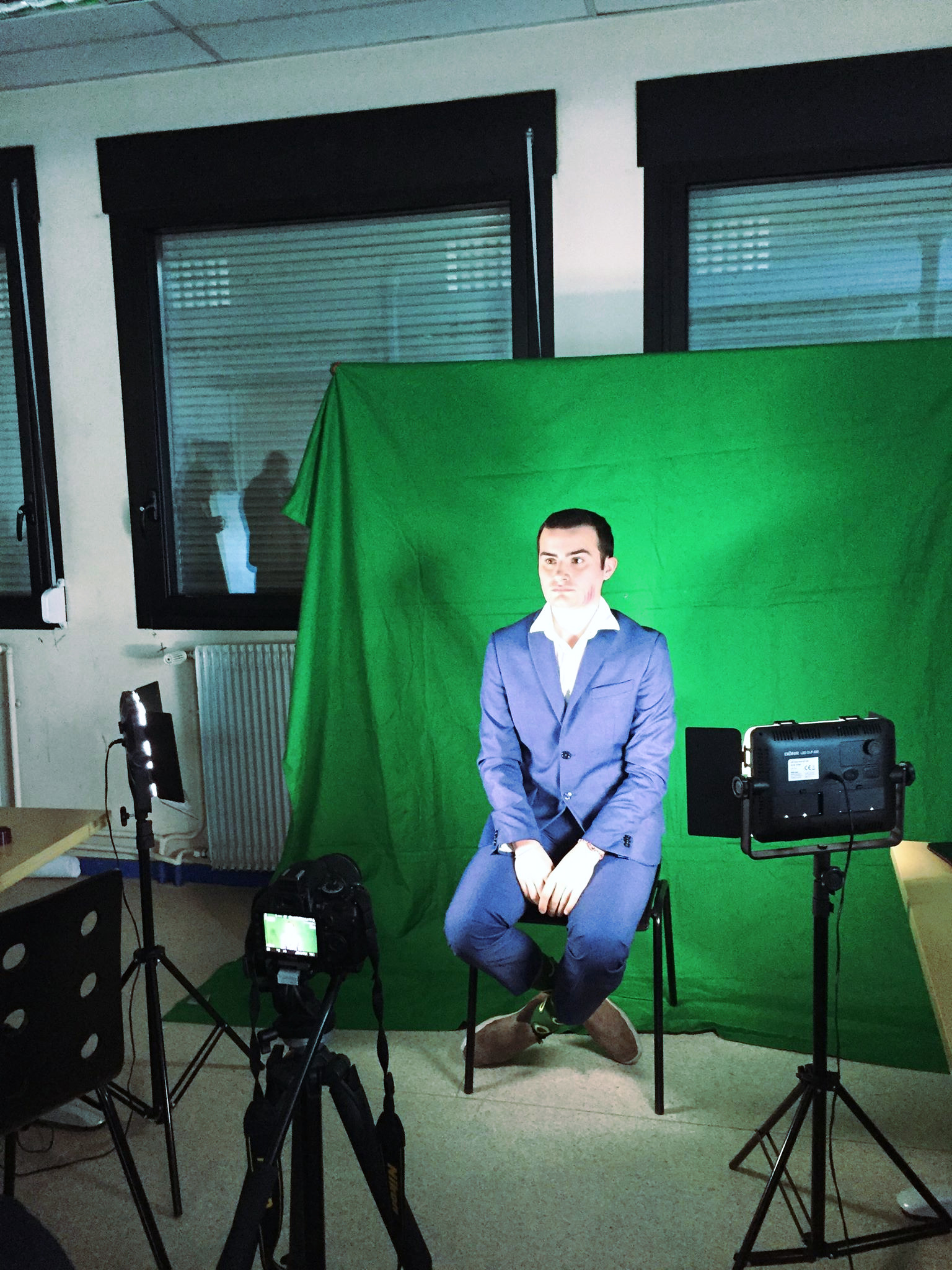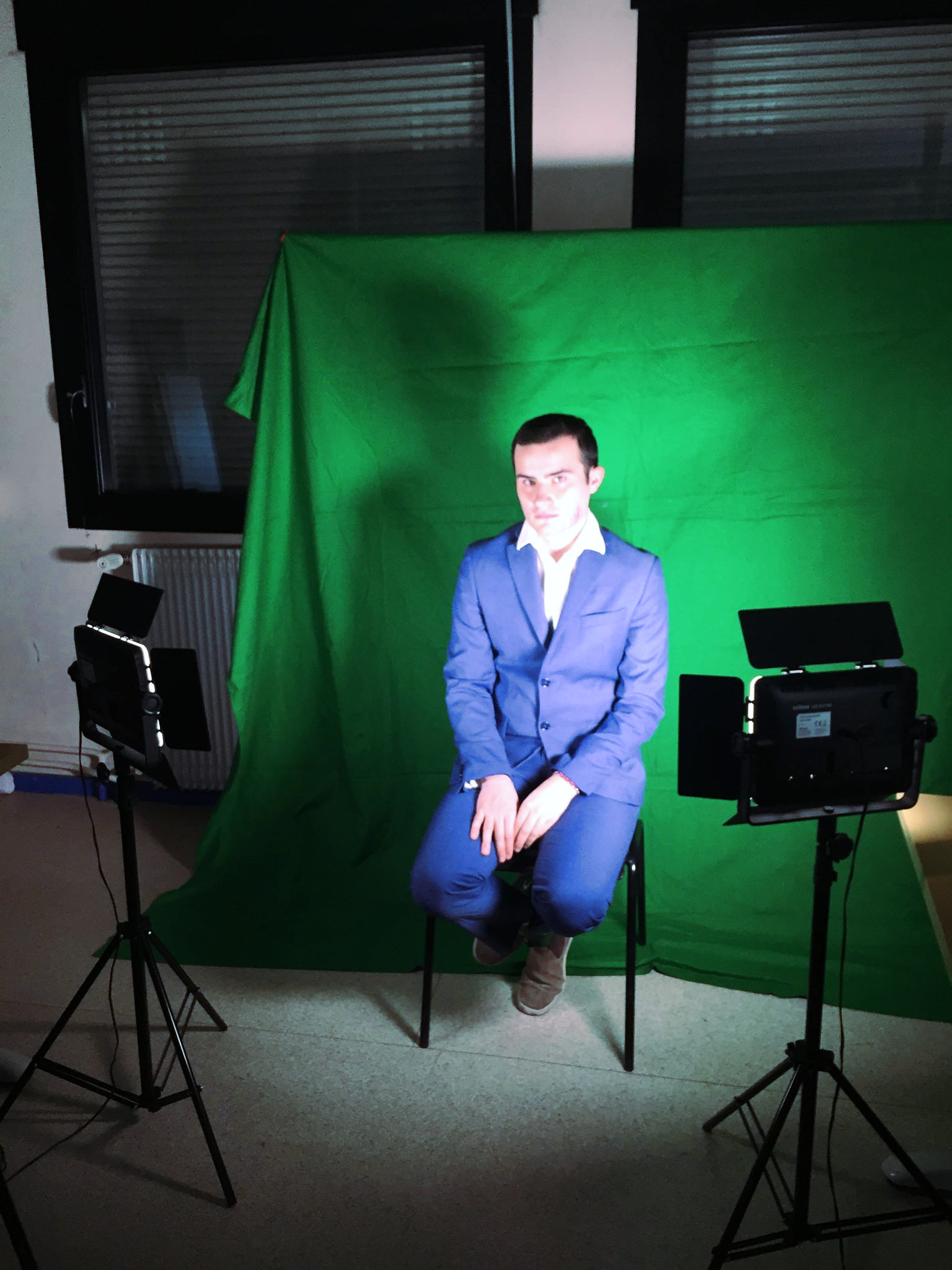 Nous avons pu filmer un de nos confrères Maël Hervé devant un fond vert. Puis nous avons retouché le fond et mis en scène le dictateur dans un journal télévisé.