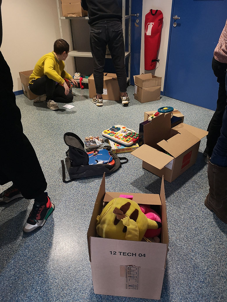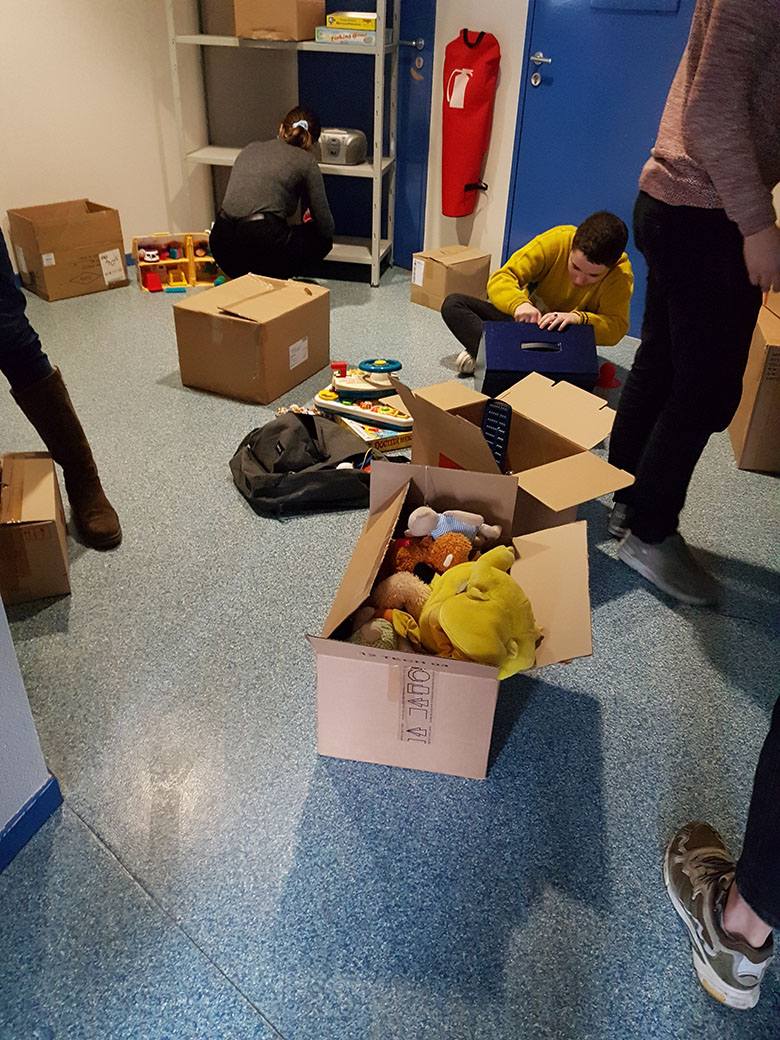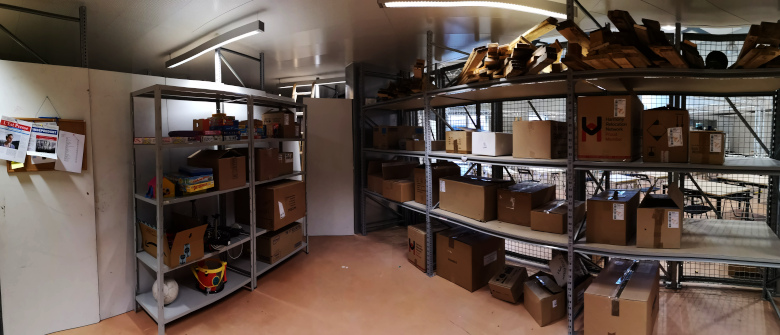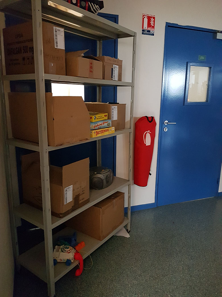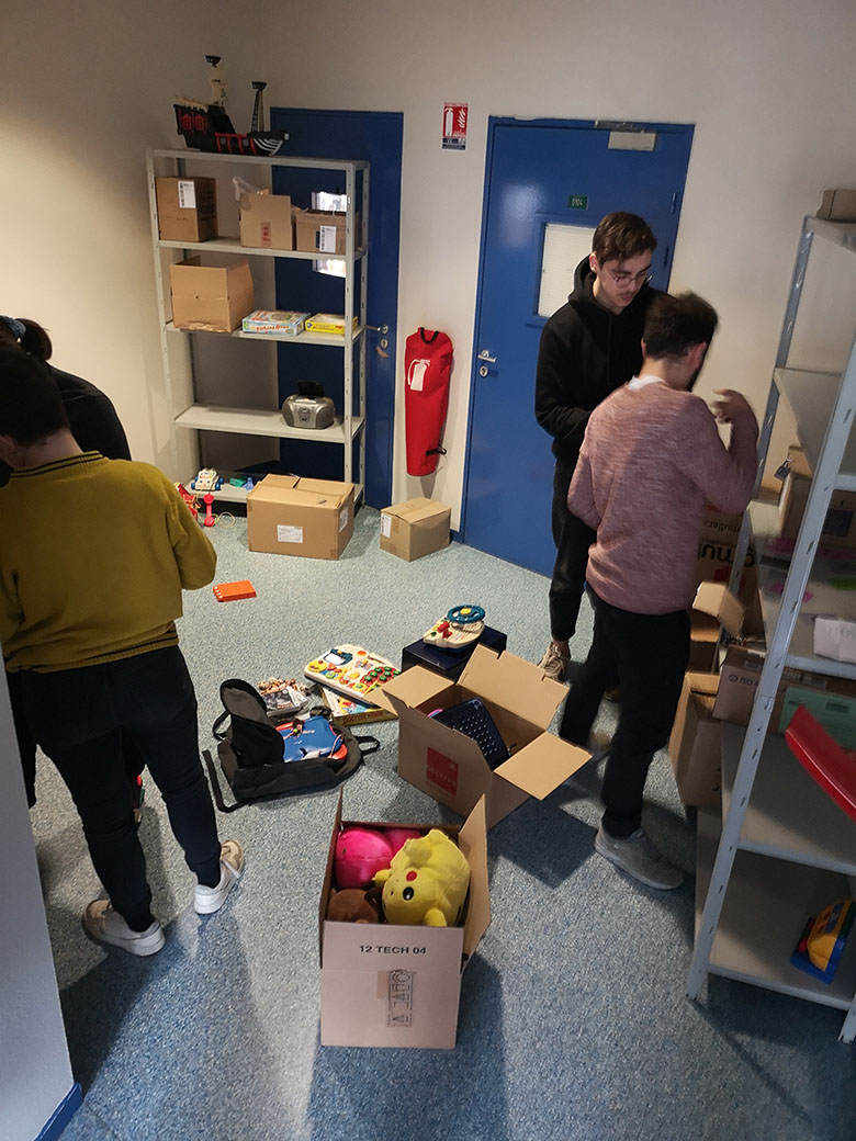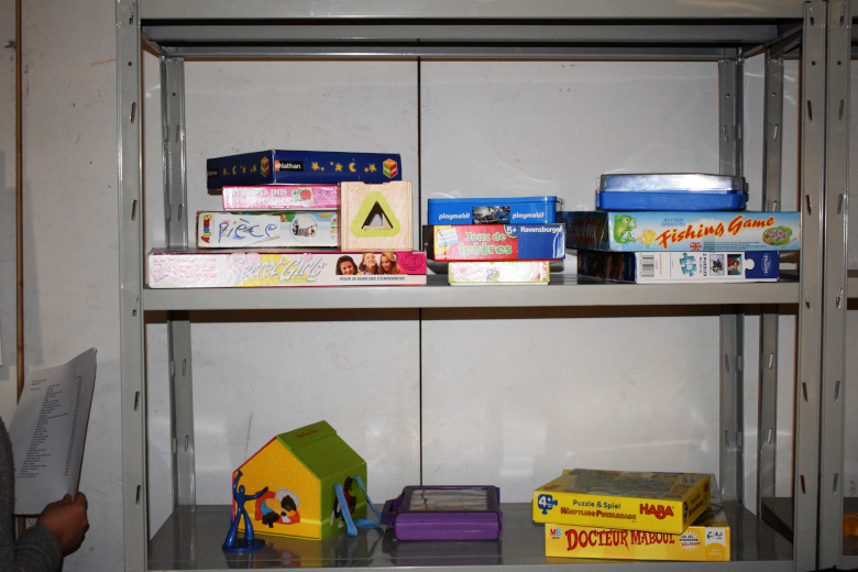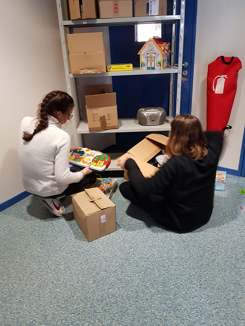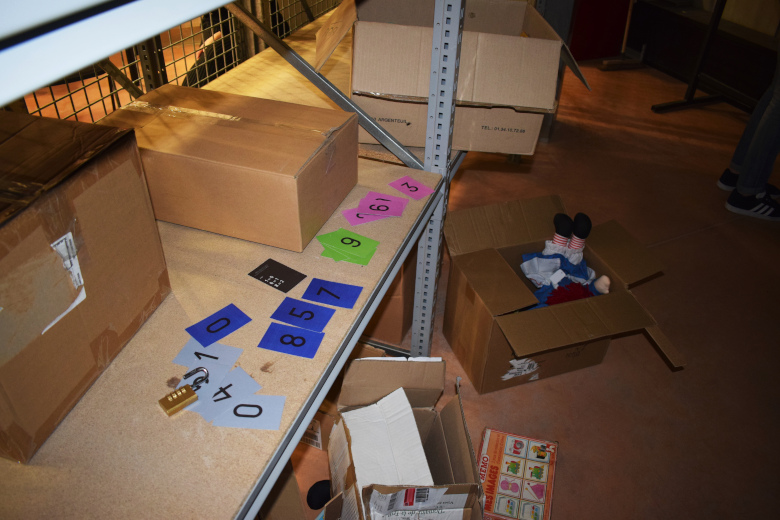 Pour notre premier test, nous avons installé notre décor dans le couloir devant la salle D105 (espace non fermé avec du passage…). Nous avions apporté deux étagères afin de créer rapidement un effet de réserve. Ce premier test était surtout là pour voir le déroulement de notre scénario ainsi que la réalisation de nos énigmes. Il nous manquait encore pas mal de cartons et de jouets, mais globalement le déroulement de l’escape game s’est bien passé.