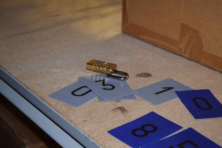 3 – Ils ont également à leur disposition un coffre et un paquet de cartes. Dans le paquet de cartes se trouvent 4 séries (identifiable par leur couleur) de 4 cartes qui comprennent chacune un chiffre. Les joueurs doivent compter le nombre de boucles qui apparaissent dans la série de chiffres de chaque couleur (la série verte comprend les chiffres 8, 8, 9 et 6, le huit comprenant 2 boucles, le 9 et le 6 une chacun, la série verte vaut donc 6). Les joueurs doivent ensuite mettre les numéros de chaque série sur le bon cadenas (identifiable grâce aux bandes de couleurs collées sur celui-ci). Après ouverture de ce coffre, les joueurs peuvent trouver un Rubik’s cube.