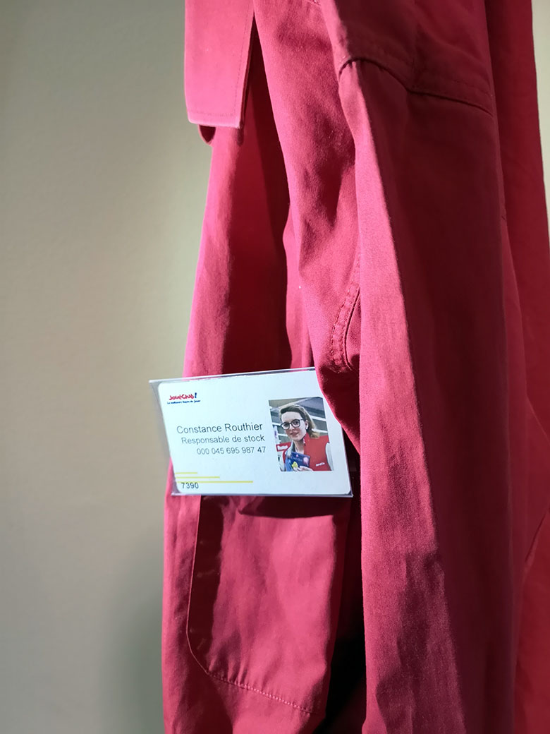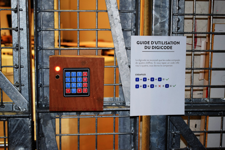 1 – Pour sortir, ils doivent trouver le badge d’un ancien membre du personnel, accroché à une veste restée dans la réserve. Sur ce badge, figure le code du digicode pour ouvrir la porte.
