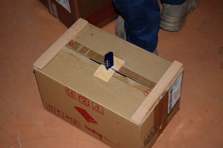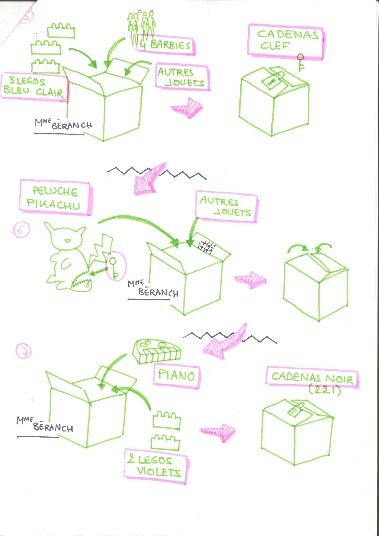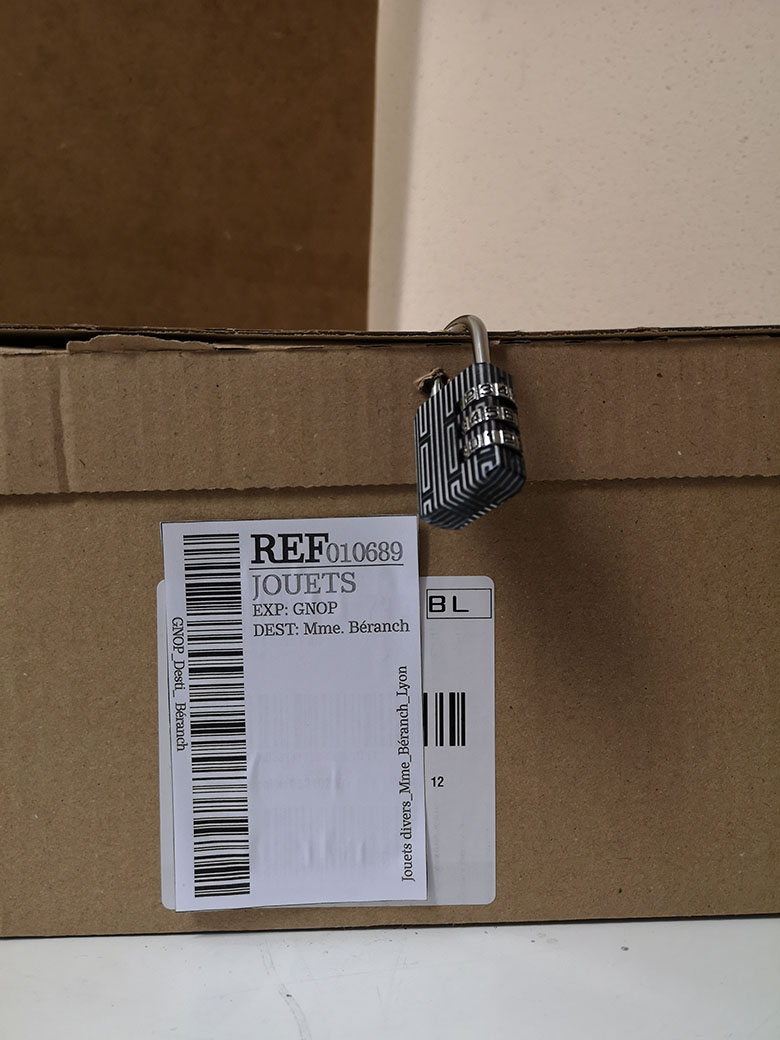 6 – Grâce aux derniers coffres, les joueurs ont à leur disposition des gros Legos en plastiques : 4 oranges, 3 violets et 2 bleus. Ils doivent alors faire le lien avec un papier glissé dans une pochette plastique sur l’un des cartons. Sur ce dernier, est adressé un mot à Mme Béranch (destinataire des 5 derniers cartons) lui indiquant qu’elle doit déduire la combinaison du cadenas grâce aux Legos trouvés précédemment. Les joueurs doivent alors compter le nombre de plots totalisés pour chaque couleur (les Legos bleus sont composés de 3 plots chacun: les joueurs en ayant trouvé deux, la couleur bleue totalise un nombre de 6 plots). Ces chiffres sont ensuite à rentrer sur le cadenas selon l’ordre indiqué dans le message. L’ouverture du cadenas permet de récupérer une DS, son chargeur ainsi que 3 jeux de DS dans le carton.