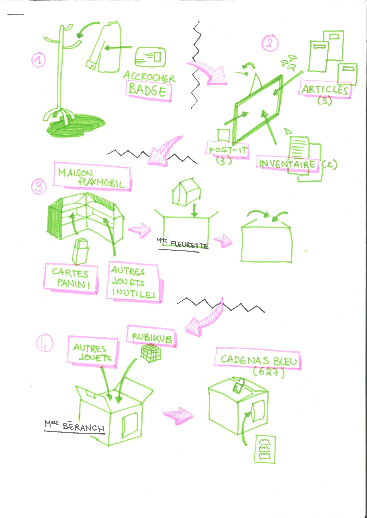 Pour continuer, après avoir ajusté notre escape game, nous avons réalisé trois autres tests dans une nouvelle salle, mieux adaptée. Dans une vraie réserve cette fois-ci, nous avons placé le double de cartons et de jouets en tous genres pour brouiller les pistes. Les joueurs avaient plus de place. Les trois groupes ont réussi de justesse à chaque fois. Nos énigmes étaient cohérentes et faisables dans la contrainte de temps. La fouille fonctionnait toujours bien. Pour le rangement de celle-ci, nous avons repensé le protocole sous forme de sketchnoting, bien plus lisible et hiérarchique. Cette deuxième phase de test était concluante. Pour aller plus loin, nous aurions pu ajouter une ambiance sonore, qui pourrait immerger encore plus les joueurs.