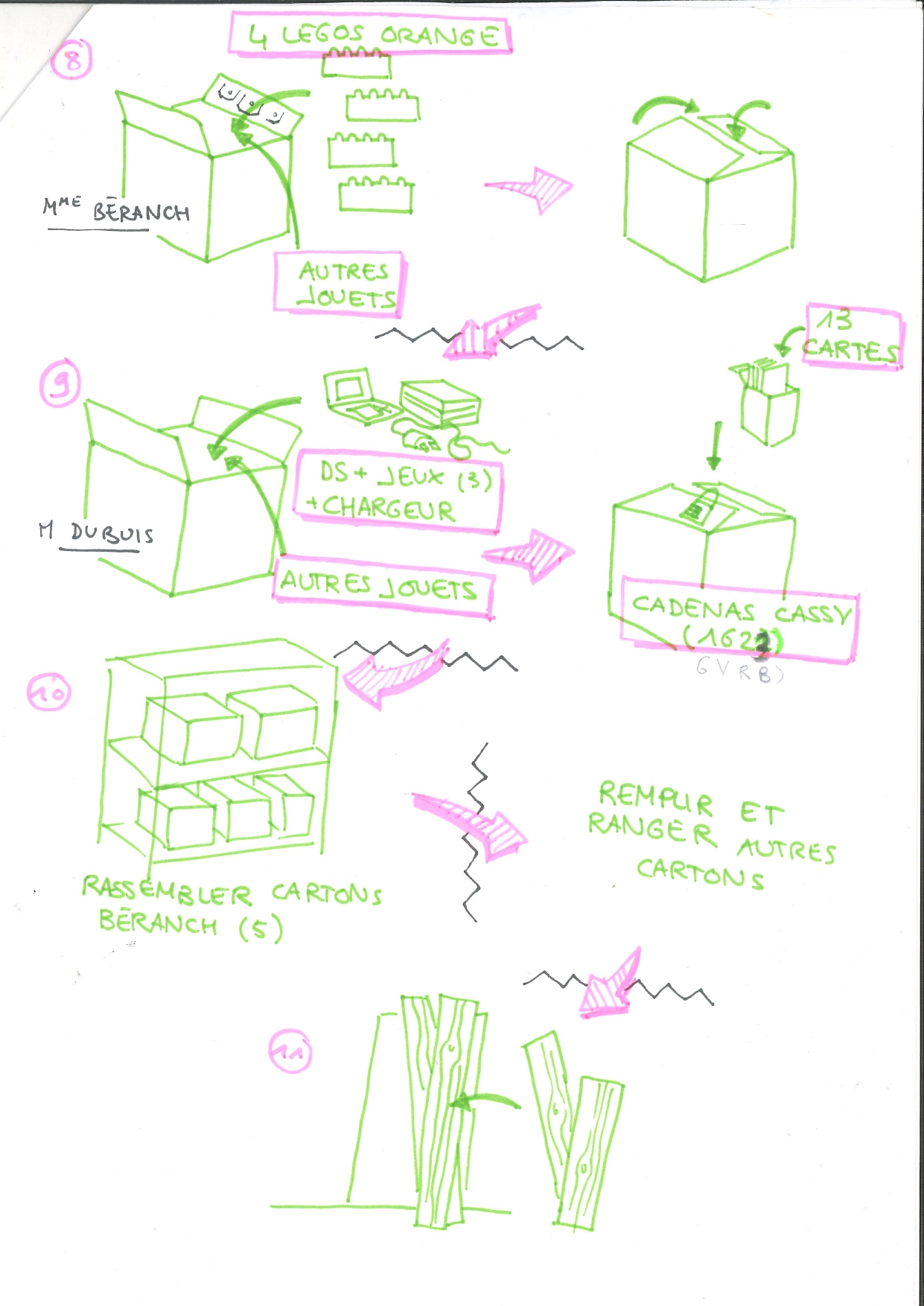 En globalité, l’escape fonctionnait bien, mais il était évident qu’il restait des points à améliorer. Les deux groupes nous ont fait des retours positifs et se sont sentis immergés dans l’univers, en partie grâce aux étiquettes des cartons. Pour renforcer le sentiment de succession de colis, nous avons tamponné chaque carton d’un même receveur avec un code couleur. Par exemple, tous les cartons de madame Béranch ont un tampon orange de la G. N. O. P. Par ailleurs, nous nous sommes vite rendu compte du bazar que la fouille produisait. Il était indispensable de rédiger un protocole de rangement. Ce protocole était d’abord sous forme de phrases, mais de ce fait, il n’était pas ergonomique.