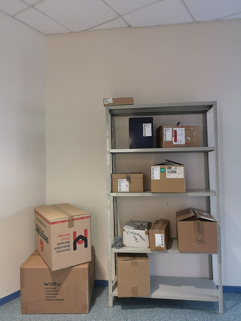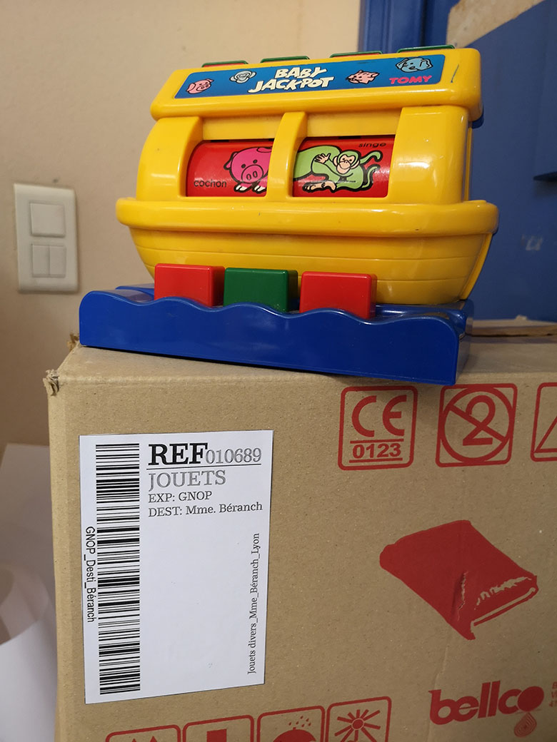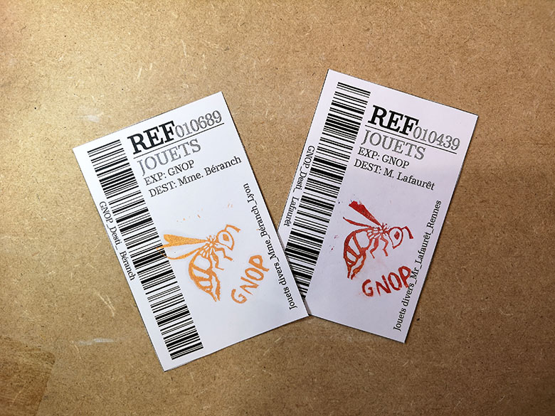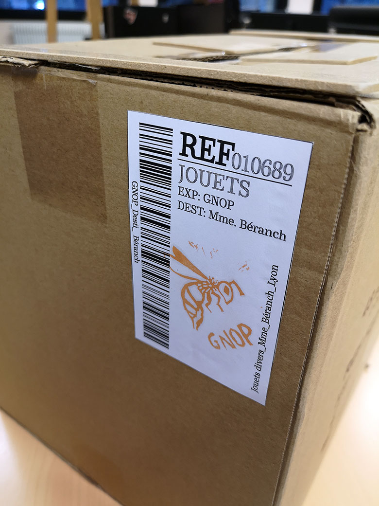 Les étiquettes d’envoi des colis avec les noms des destinataires sont aussi là pour permettre de s’immerger davantage. Là encore, nous avons tamponné sur chaque boîte à livrer avec le tampon de la G.N.O.P. en prenant une couleur différente pour chaque destinataire. Cela permet de faire la différence entre tous les cartons de la réserve, mais aussi de voir que c’est la G.N.O.P. qui gère les livraisons.