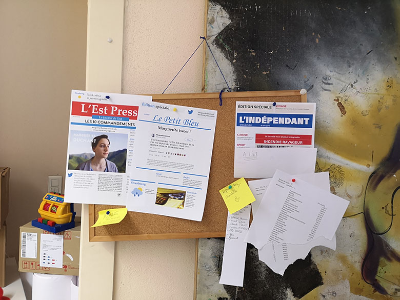 Comme nous avons décidé de faire notre escape game en immersion dans une réserve de magasin “JouéClub”, lieu peu touché par les objets de culte de la dictature, nous avons réfléchi à comment transmettre le contexte de notre dictature verte avec cette contrainte.