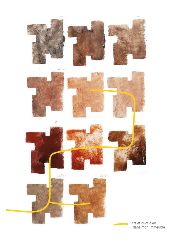 L’immeuble où j’habite est finalement un endroit que je ne connais pas beaucoup. Je fréquente peu de voisins. La première chose qui m’a marqué dans mon appartement quand j’ai emménagé dedans pour mes études il y a 2 ans est le nombre d’étages. 9 étages, pour moi ça paraît beaucoup, car je n’avais jamais vécu auparavant en appartement, c’était donc un peu la découverte de voir un immeuble si grand. J’ai donc souhaité représenter les différents étages d’une couleur différente pour chacun.