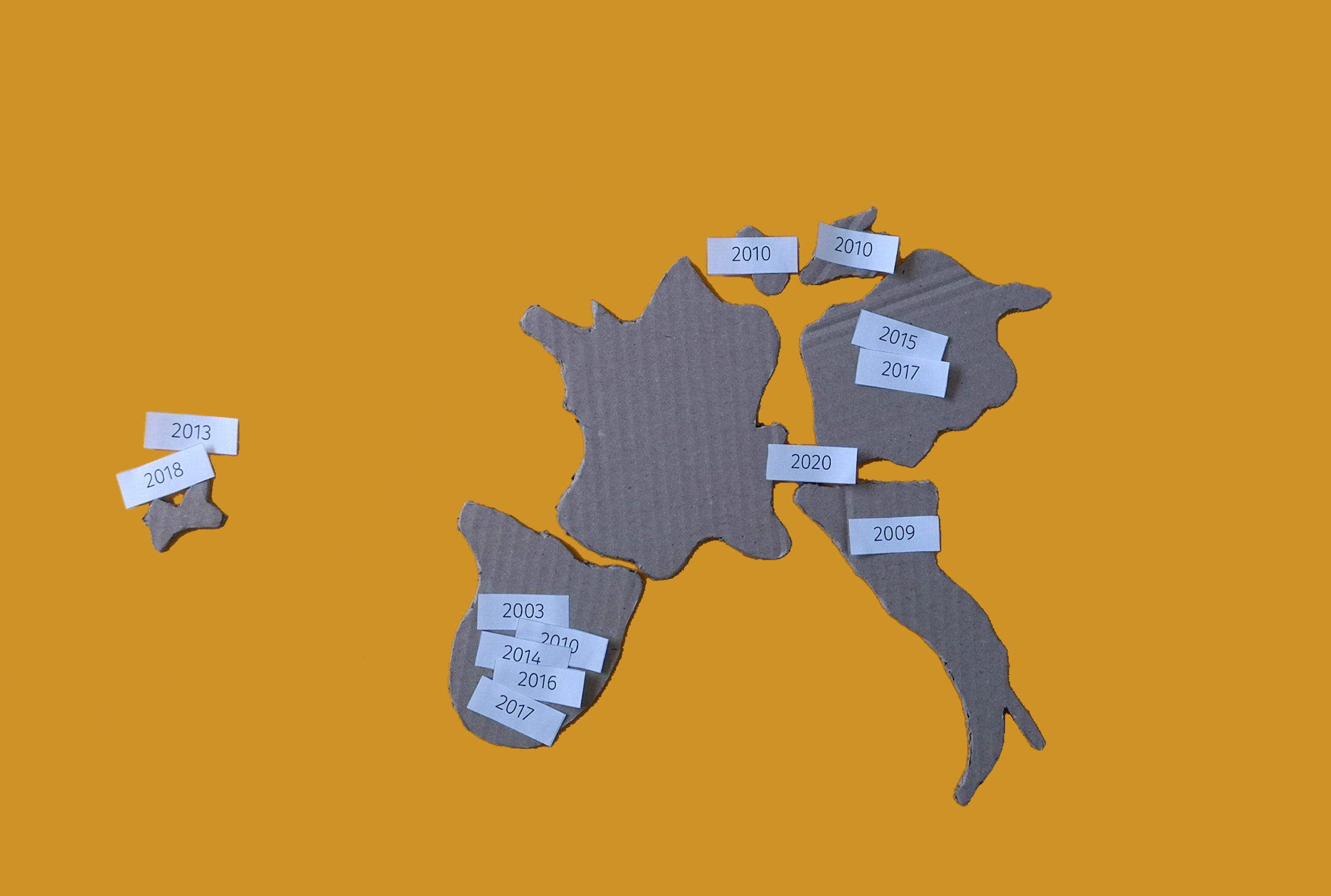 Depuis que je suis jeune, avec mes parents, j’ai eu la chance de me déplacer beaucoup pendant les vacances en France, principalement et quelques fois à l’étranger. J’ai donc souhaité représenter par des dates tous les pays européens que j’ai pu visiter.