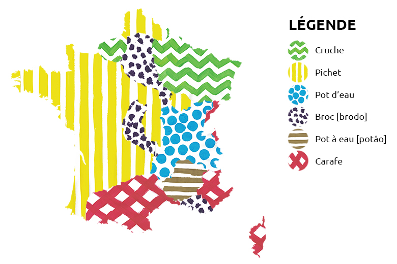Avec le temps, nous faisons des rencontres. Ces rencontres ont des caractères, mais aussi des façons de parler différentes des nôtres, en fonction des régions. Cette carte représente différentes manières de parler d’un pichet, ou encore d’un pot à eau au niveau national.