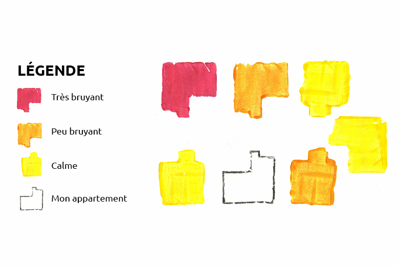 Ceci est une représentation du palier de mon immeuble. Étant entouré, j’entends les moindres bruits des voisins… Étonnement, les plus bruyants, malgré leur position, sont les plus éloignés (ils crient vraiment fort).