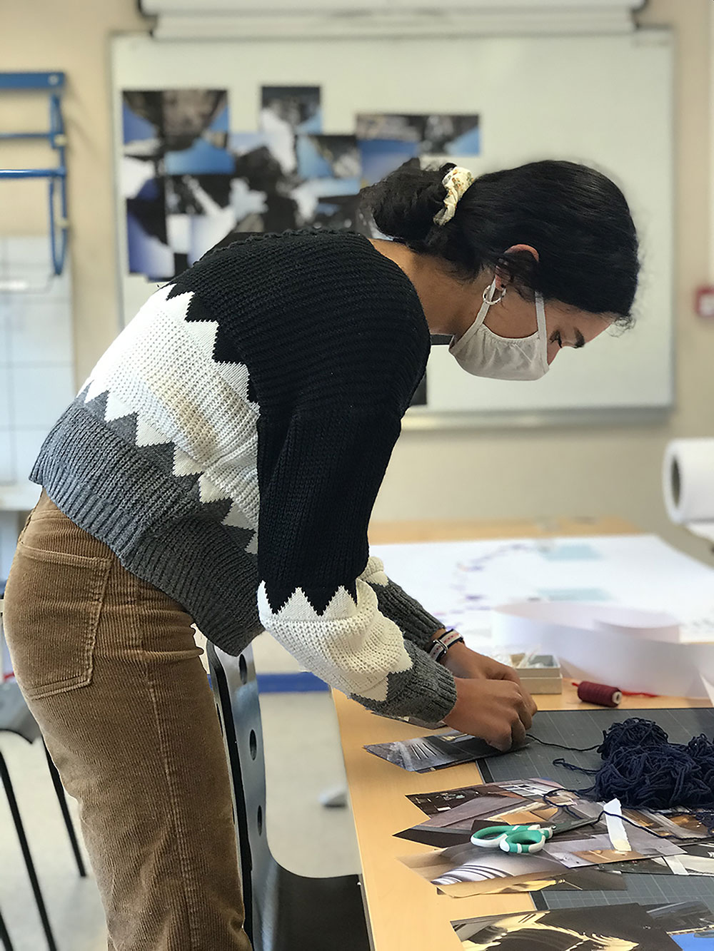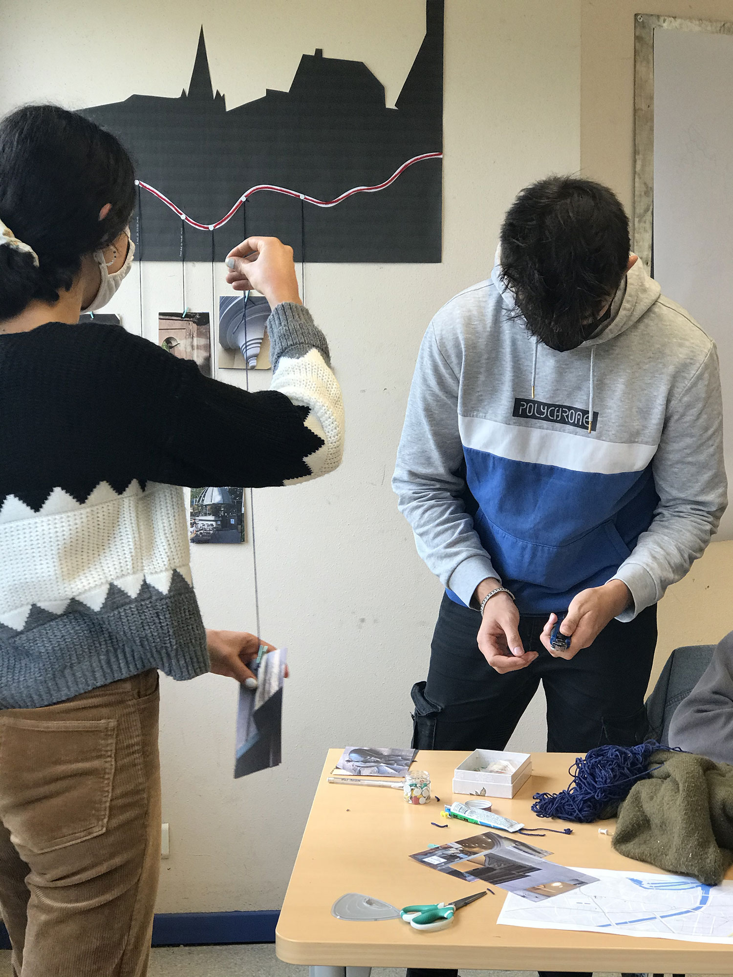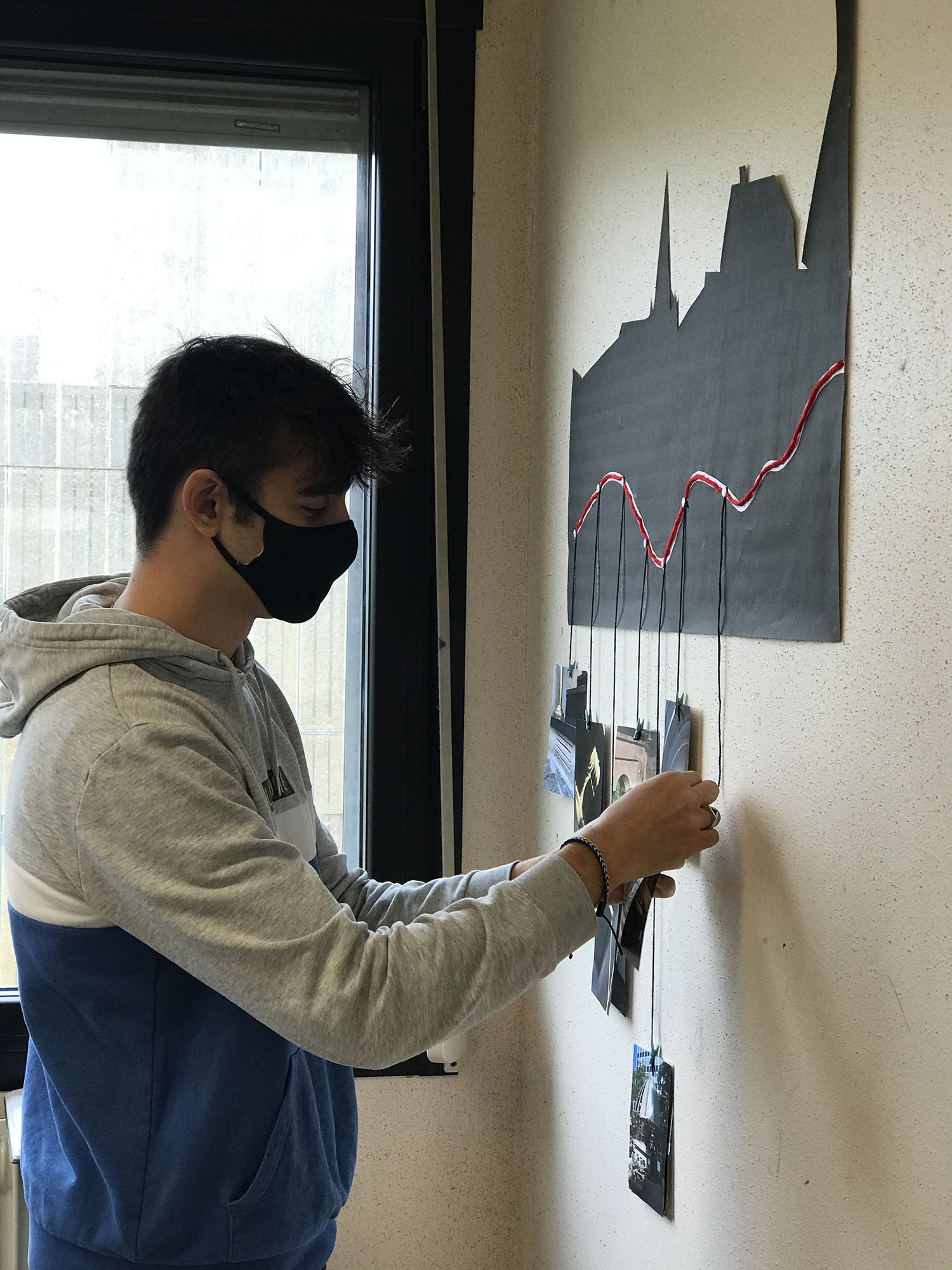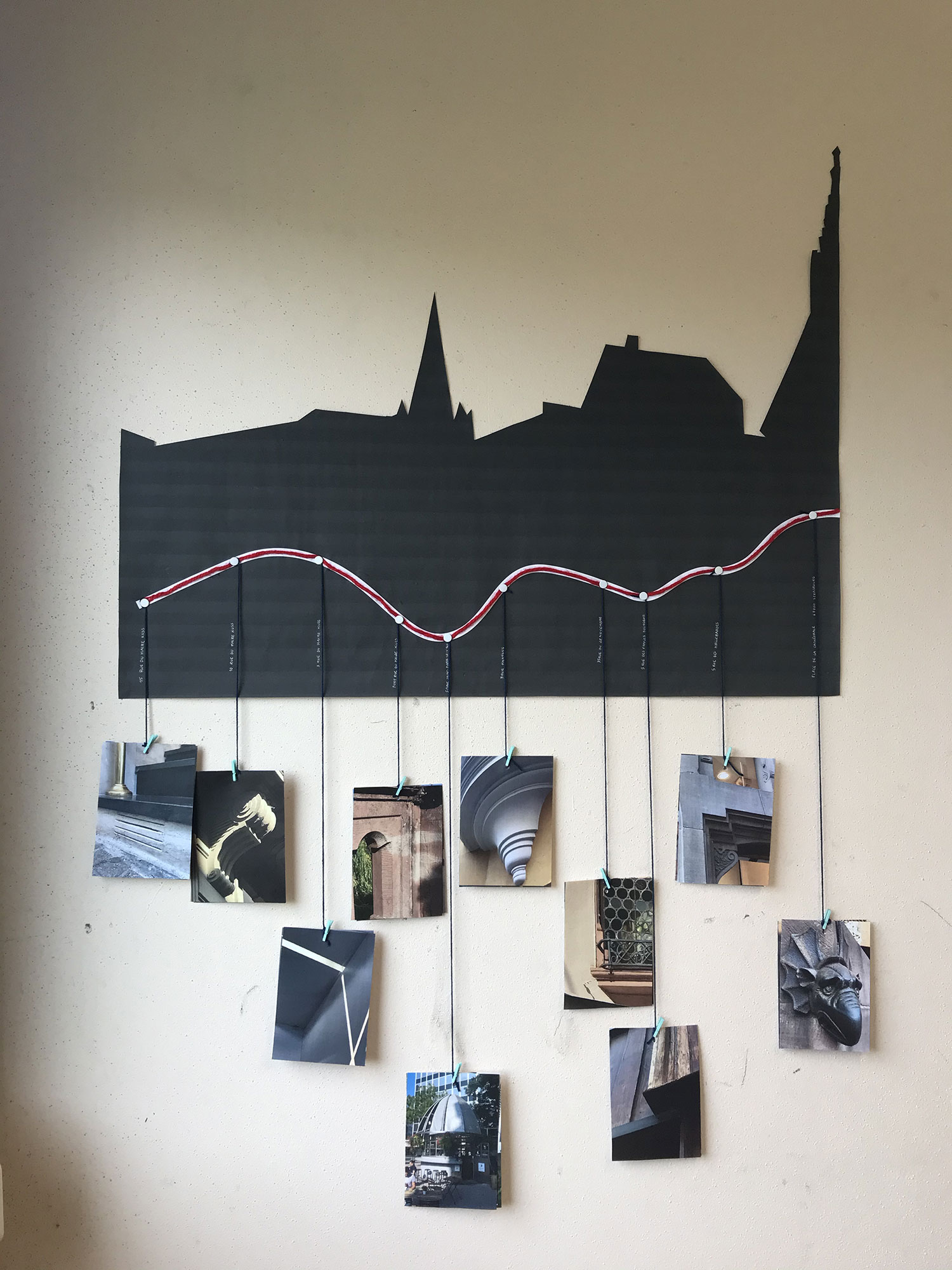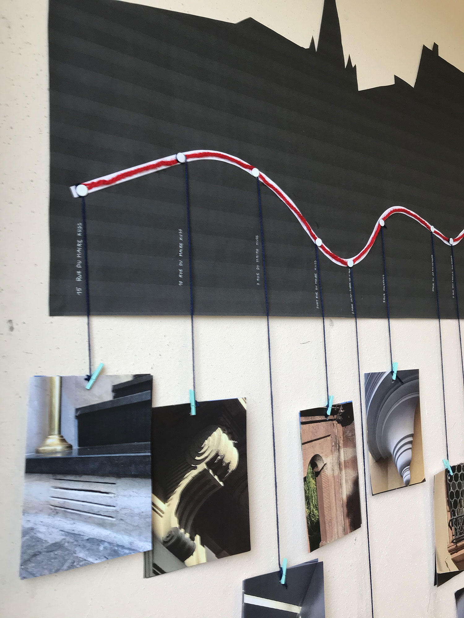 Pour retranscrire les informations, notre choix s’est tourné sur une silhouette de bâtiments de la ville de Strasbourg, sur laquelle s’étend un fil rouge représentant notre parcours. Après avoir sélectionné 9 paires des nombreuses photos, nous les avons suspendues à des fils de laine. La photo présentant le détail architectural en plan rapproché a été placée devant celle de sa vue globale (donc en superposition). Les adresses des différents lieux ont été inscrites le long des ficelles.