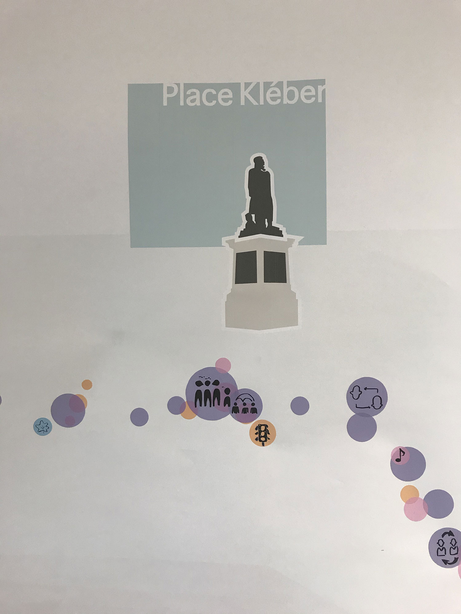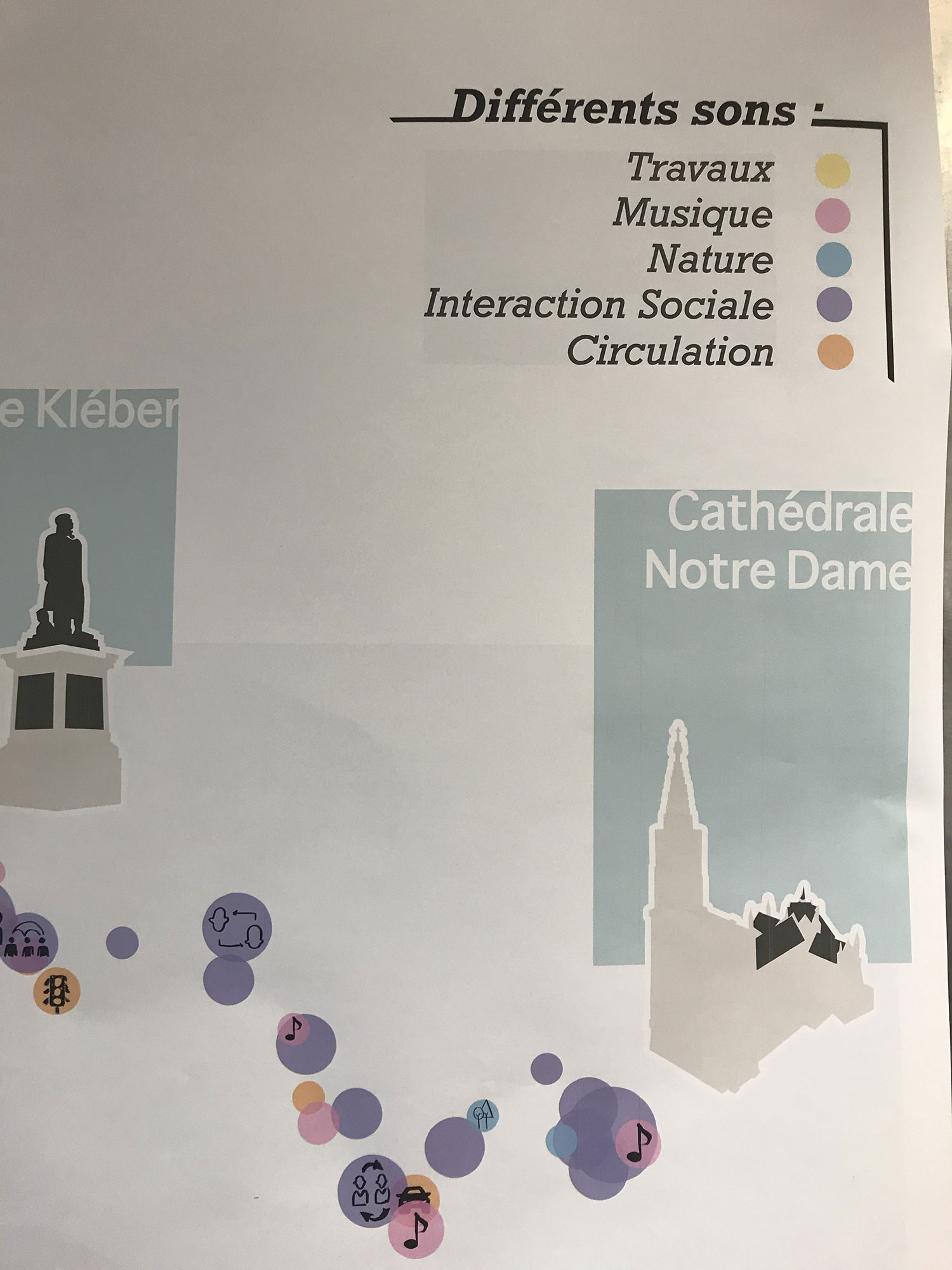 Pour ce qui est du premier protocole, nous avons relevé une série de sons. À la suite de la balade sensible, nous avons représenté sous forme d’icônes les différents bruits et leur intensité. Il était intéressant de voir comment chacun ressent et mémorise les sons de manière sélective ou subjective. Pour cela nous avons réalisé une carte numériquement en utilisant des pictogrammes (plus ou moins gros selon leur intensité) et des couleurs pour représenter les types de son. Des silhouettes de monuments ont été choisies pour situer la carte.