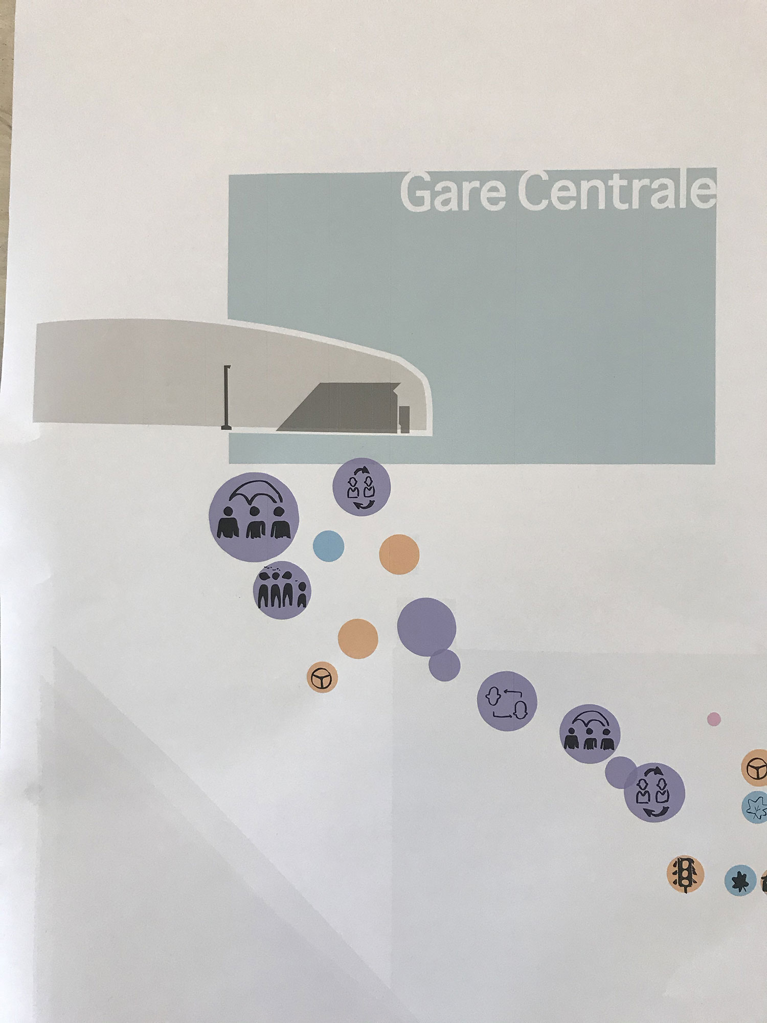Très souvent, nous traversons l’espace urbain sans y prêter forcément attention. Pourtant, la vue et plus particulièrement l’ouïe, y jouent un rôle essentiel. Il a été décidé que nous irions de la place du château jusqu’à la gare (trajet aller et retour) afin de récolter des données sensibles. Cette marche a eu lieu le 17 septembre 2020. Nous avons établi deux protocoles dans le but de réaliser une cartographie sensible de l’espace urbain, sous deux approches différentes.
