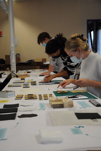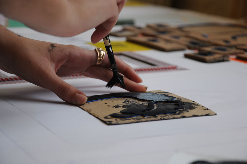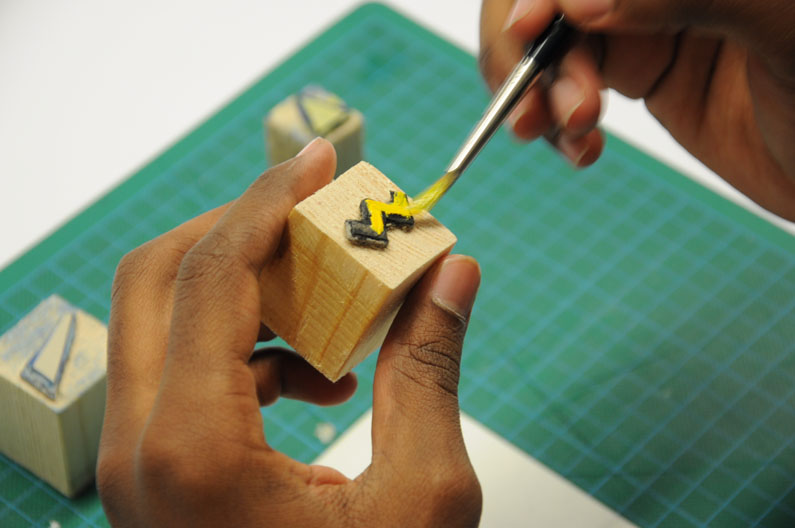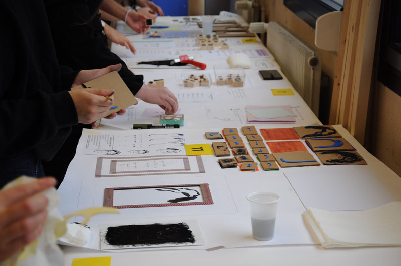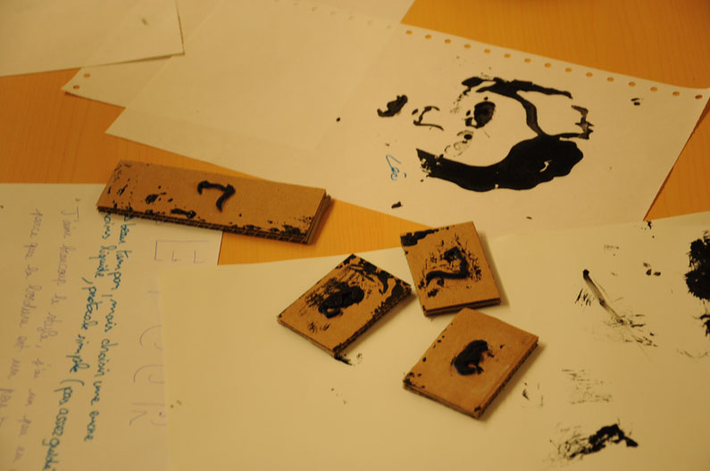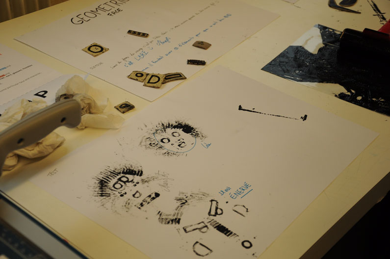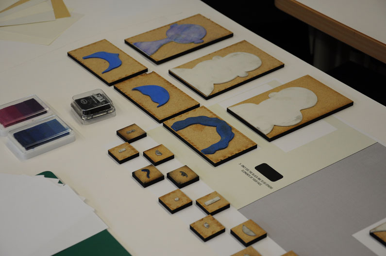 Suite à ce test, les tampons et les protocoles sont réajustés, on ajoute des manches et des supports en bois aux éléments linogravés.