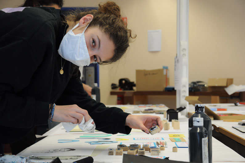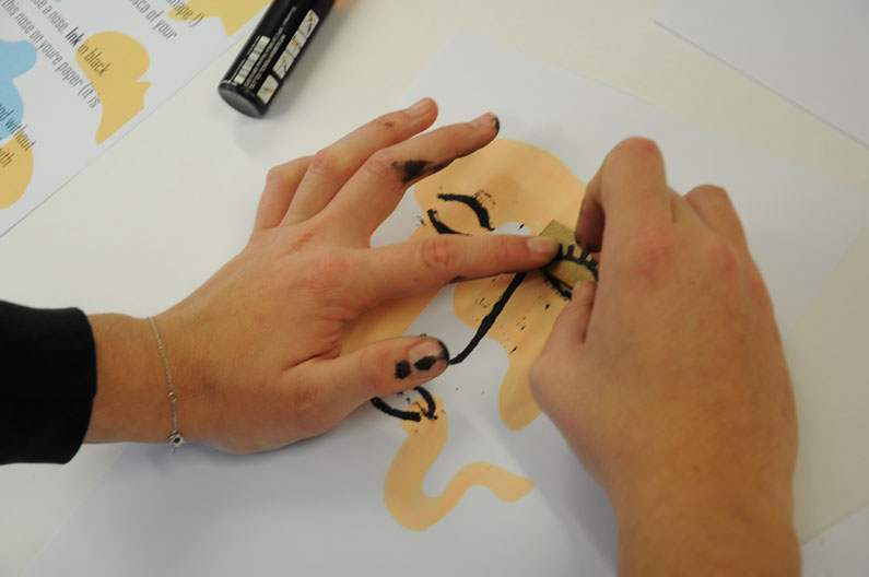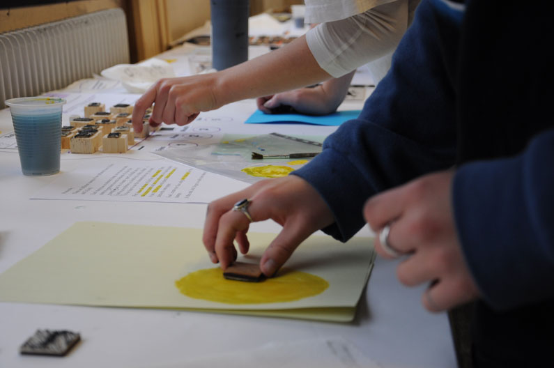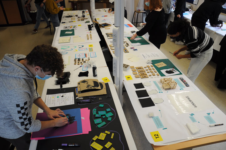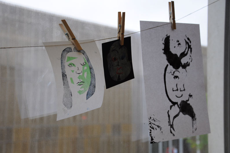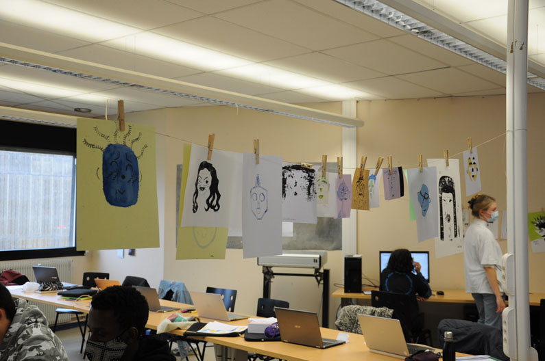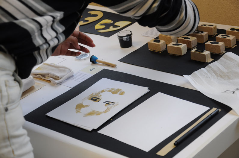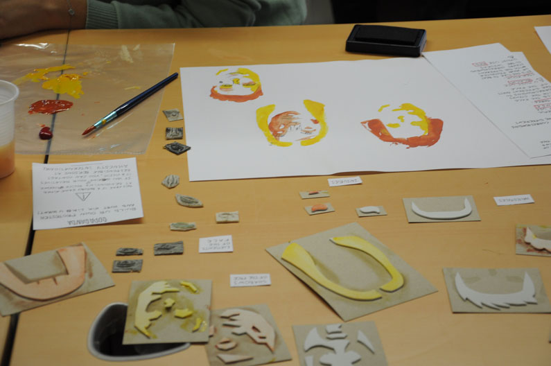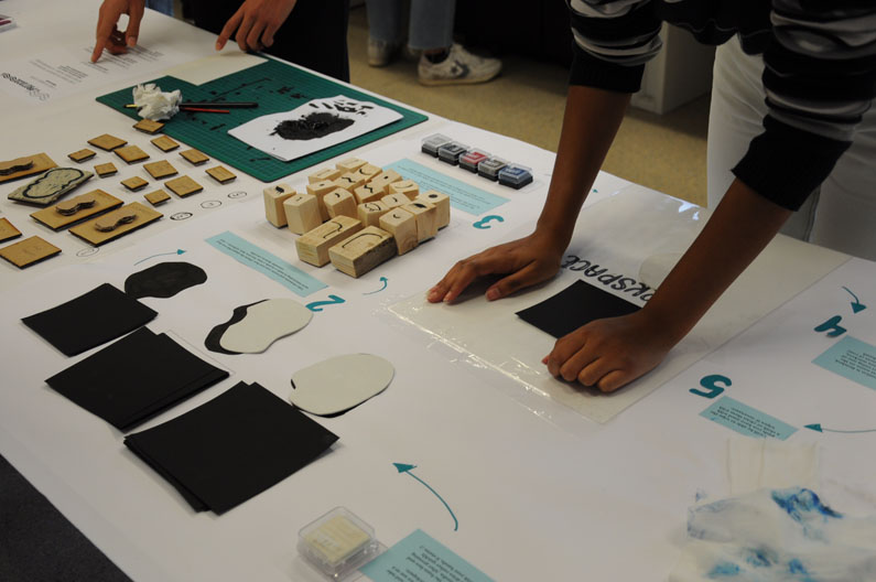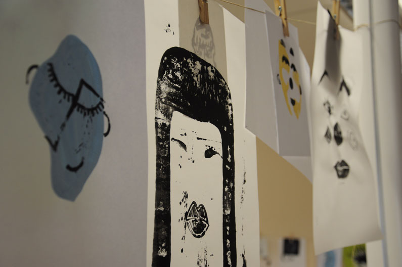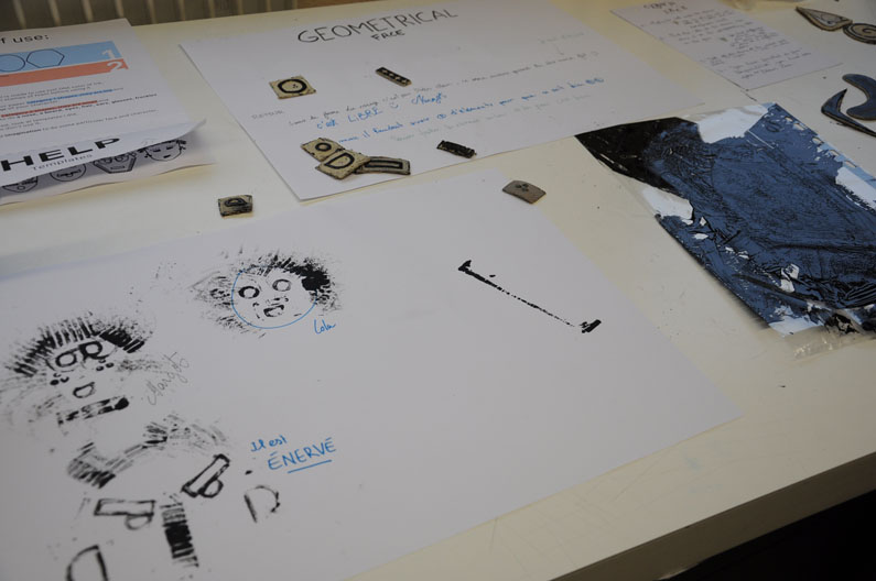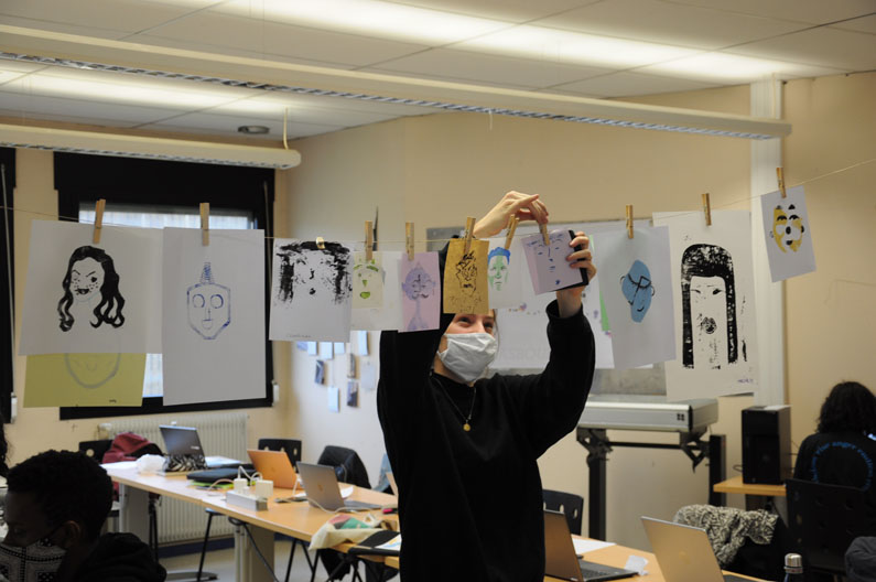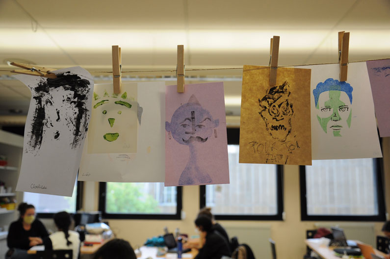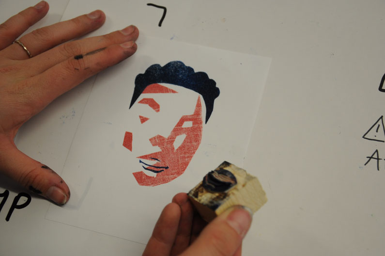 Durant les premières séances, chacun·e expérimente la technique de la linogravure, et conçoit des tampons encreurs permettant une fois combinés de représenter un visage.