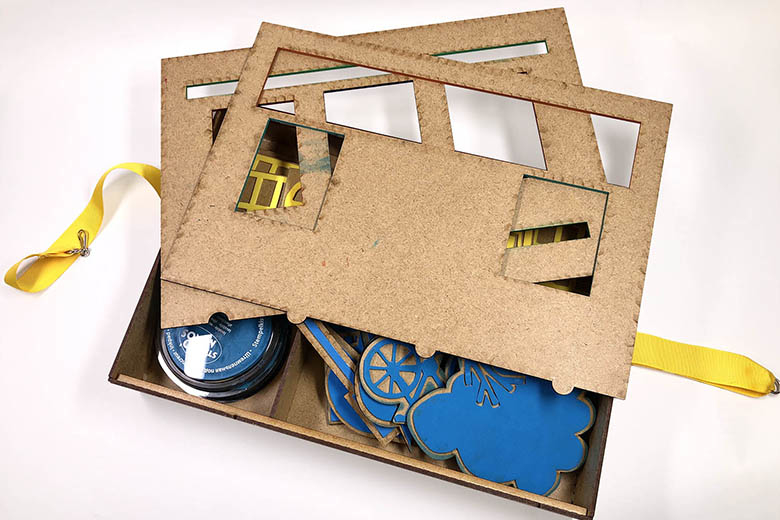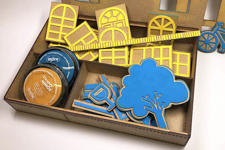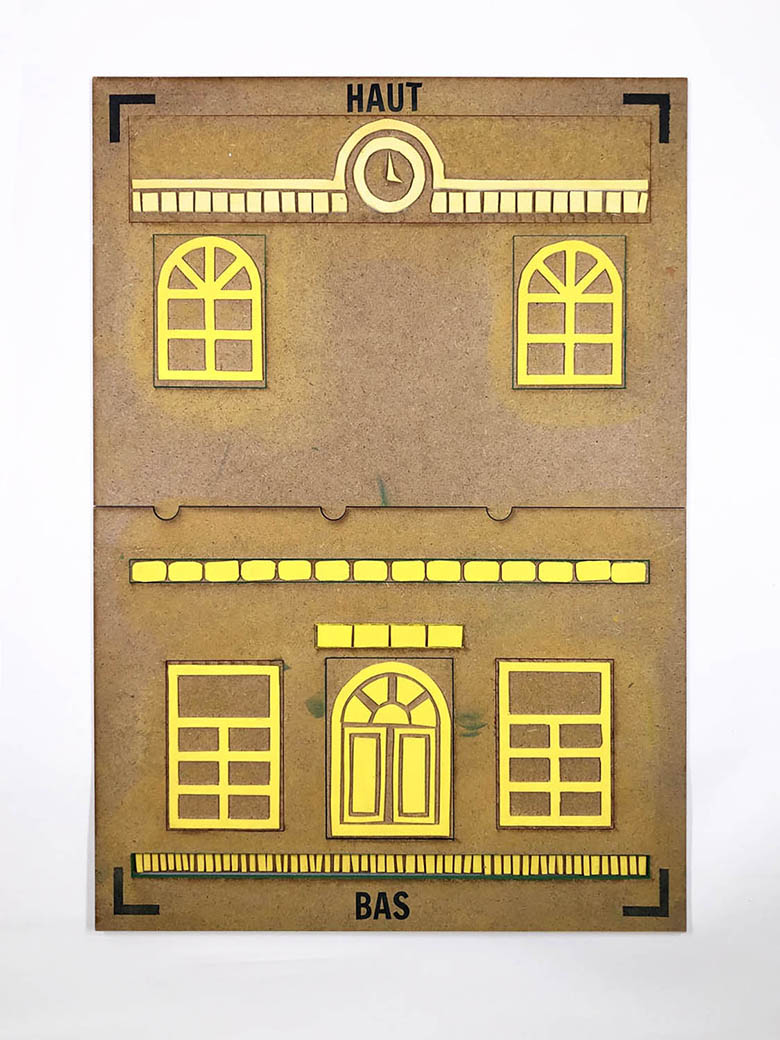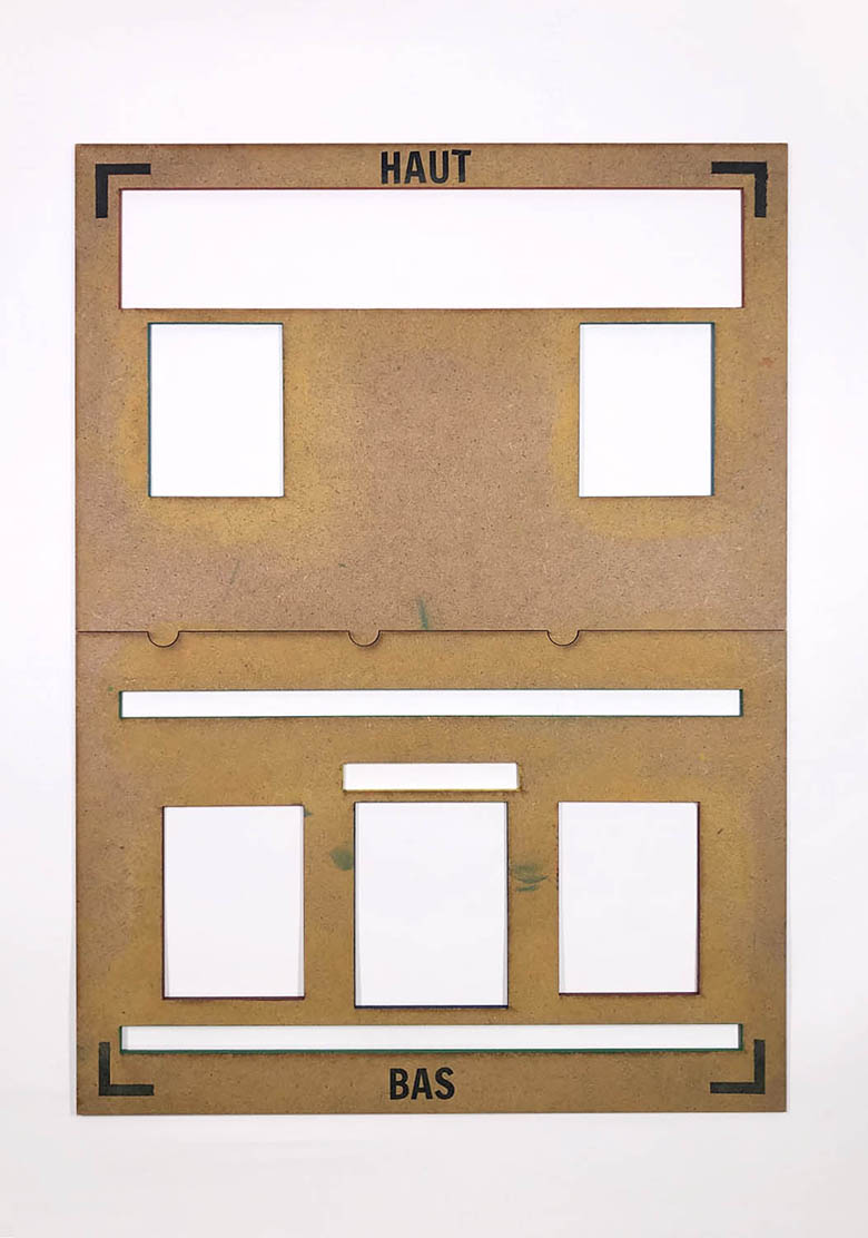 Ensuite, grâce au kit de matériel fourni, l’usager assemble deux planches qui forment un gabarit et qui lui permet de positionner des fenêtres, une porte et des briques afin de symboliser une mairie. Ensuite, à l’aide de tampons pictogrammes, il peut illustrer son propos.